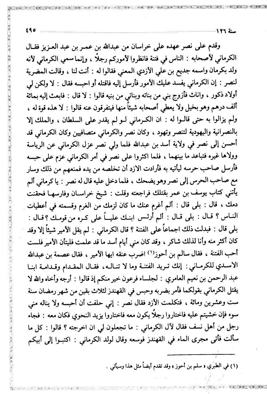 وقدم على نصر عهده على خراسان من عبد الله بن عمر بن عبد العزيز فقال الكرماني لأصحابه الناس في فتنة فانظروا لأموركم رجلا وإنما سمي الكرماني لأنه ولد بكرمان واسمه جديع بن علي الأزدي المعني فقالوا له أنت لنا وقالت المضرية لنصر إن الكرماني يفسد عليك الأمور فأرسل غليه فاقتله أو احبسه فقال لا ولكن لي أولاد ذكور واناث فأزوج بني من بناته وبناتي من بنيه قالوا لا قال فابعث إليه بمائة ألف درهم وهو بخيل ولا يعطي أصحابه شيئا منها فيتفرقون عنه قالوا لا هذه قوة له ولم يزالوا به حتى قالوا له ان الكرماني لو لم يقدر على السلطان والملك إلا بالنصرانية واليهودية لتنصر وتهود وكان نصر والكرماني متصافين وكان الكرماني قد أحسن إلى نصر في ولاية أسد بن عبد الله فلما ولي نصر عزل الكرماني عن الرياسة وولاها غيره فتباعد ما بينهما فلما اكثروا على نصر في أمر الكرماني عزم على حبسه فأرسل صاحب حرسه ليأتيه به فأرادت الازد أن تخلصه من يده فمنعهم من ذلك وسار مع صاحب الحرس إلى نصر وهو يضحك فلما دخل عليه قال له نصر يا كرماني ألم يأتني كتاب يوسف بن عمر بقتلك فراجعته وقلت شيخ خراسان وفارسها فحقنت دمك قال بلى قال ألم أغرم عنك ما كان لزمك من الغرم وقسمته في أعطيات الناس قال بلى قال ألم أرئس ابنك عليا على كره من قومك قال بلى قال فبدلت ذلك اجماعا على الفتنة قال الكرماني لم يقل الأمير شيئا إلا وقد كان أكثر منه وأنا لذلك شاكر وقد كان مني أيام أسد ما قد علمت فليتأن الأمير فلست أحب الفتنة فقال سالم بن أحوز اضرب عنقه ايها الأمير فقال عصمة بن عبد الله الاسدي للكرماني إنك تريد الفتنة وما لا تناله فقال المقدام وقدامة ابنا عبد الرحمن بن نعيم العامري لجلساء فرعون خير منكم إذ قالوا أرجه وأخاه والله لا يقتل الكرماني بقولكما فأمر بضربه وحبس في القهندز لثلاث بقين من شهر رمضان سنة ست وعشرين ومائة فتكلمت الأزد فقال نصرإني حلفت أن أحبسه ولا يناله مني سوء فإن خشيتم عليه فاختاروا رجلا يكون معه فاختاروا يزيد النحوي فكان معه فجاء رجل من أهل نسف فقال لآل الكرماني ما تجعلون لي ان اخرجته قالوا كل ما سألت فأتى مجرى الماء في القهندز فوسعه وقال لولد الكرماني اكتبوا إلى أبيكم