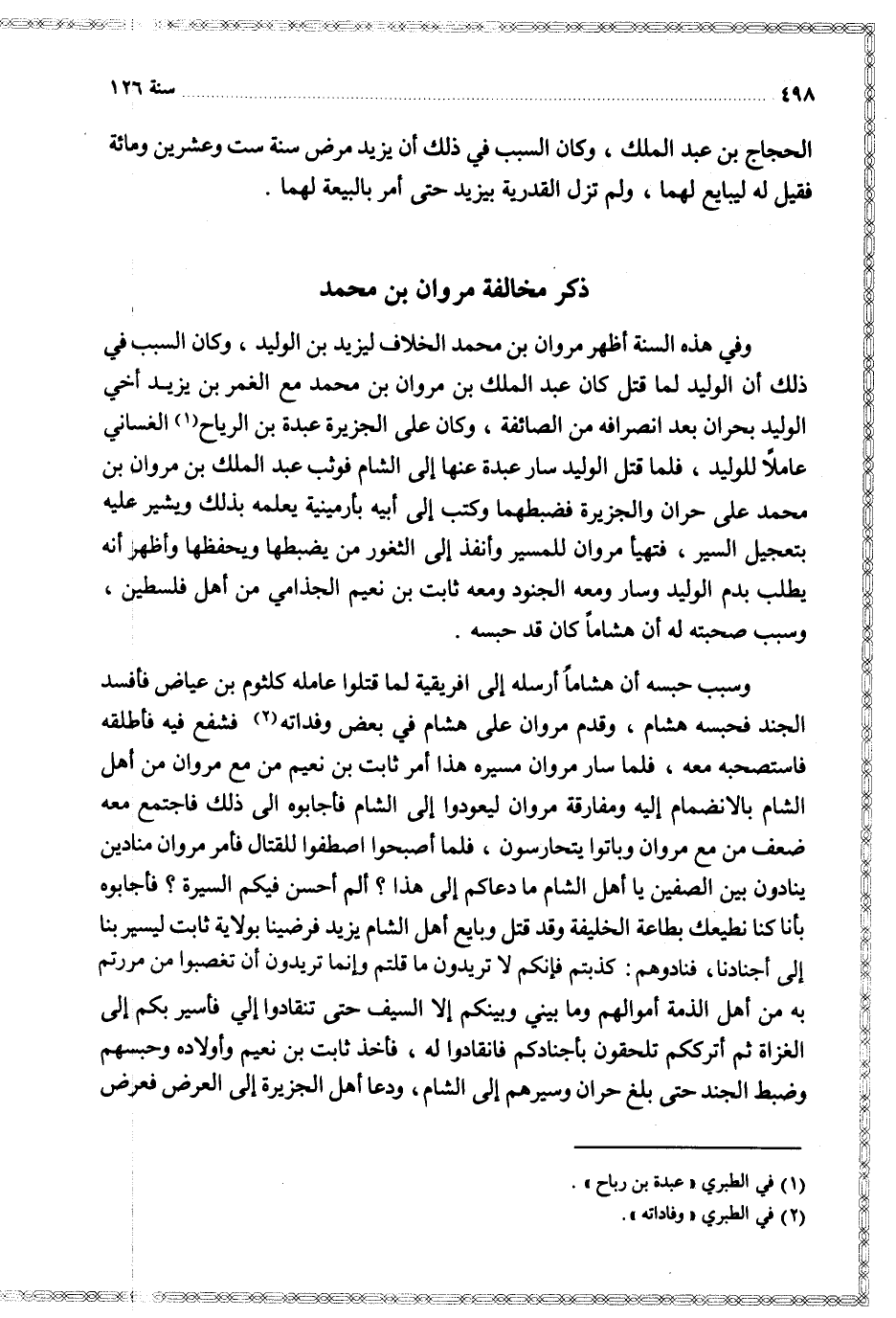 وفي هذه السنة أظهر مروان بن محمد الخلاف ليزيد بن الوليد وكان السبب في ذلك أن الوليد لما قتل كان عبد الملك بن مروان بن محمد مع الغمر بن يزيد أخي الوليد بحران بعد انصرافه من الصائفة وكان على الجزيرة عبدة بن الرياح الغساني عاملا للوليد فلما قتل الوليد سار عبدة عنها إلى الشام فوثب عبد الملك بن مروان بن محمد على حران والجزيرة فضبطهما وكتب إلى أبيه بأرمينية يعلمه بذلك ويشير عليه بتعجيل السير فتهيأ مروان للمسير وأنفذ إلى الثغور من يضبطها ويحفظها وأظهر أنه يطلب بدم الوليد وسار ومعه الجنود ومعه ثابت بن نعيم الجذامي من أهل فلسطين وسبب صحبته له أن هشاما كان قد حبسه