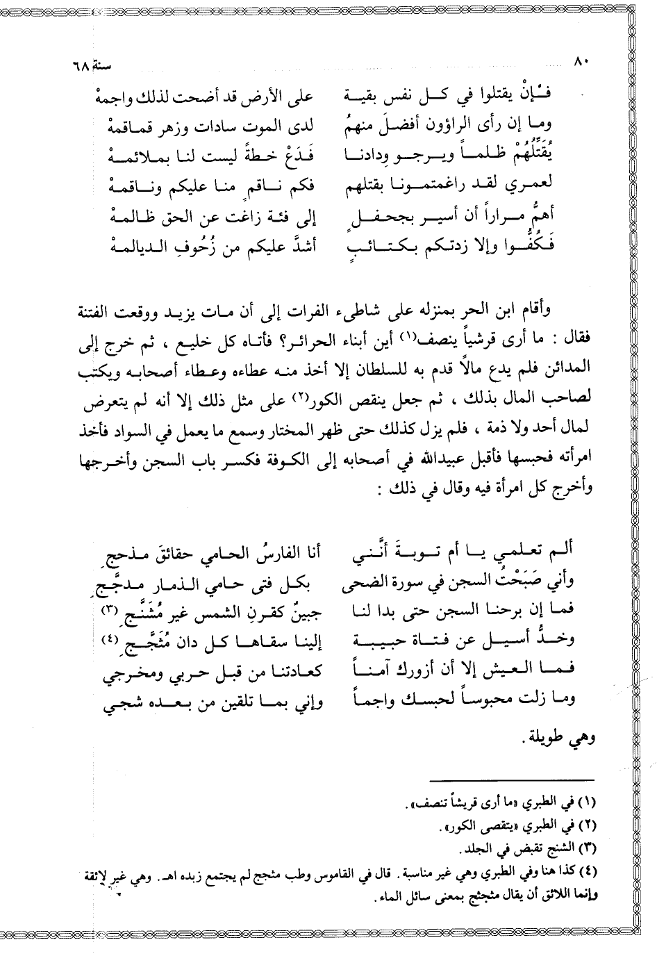 وأقام ابن الحر بمنزله على شاطئ الفرات إلى أن مات يزيد ووقعت الفتنة فقال ما أرى قرشيا ينصف أين أبناء الحرائر فأتاه كل خليع ثم خرج إلى المدائن فلم يدع مالا قدم به السلطان إلا أخذ منه عطاءه وعطاء أصحابه ويكتب لصاحب المال بذلك ثم جعل ينقص الكور على مثل ذلك إلا أنه لم يتعرض لمال أحد ولا ذمة فلم يزل كذلك حتى ظهر المختار وسمع ما يعمل في السواد فأخذ امرأته فحبسها فأقبل عبيد الله في أصحابه إلى الكوفة فكسر باب السجن وأخرجها وأخرج كل أمرأة فيه وقال في ذلك