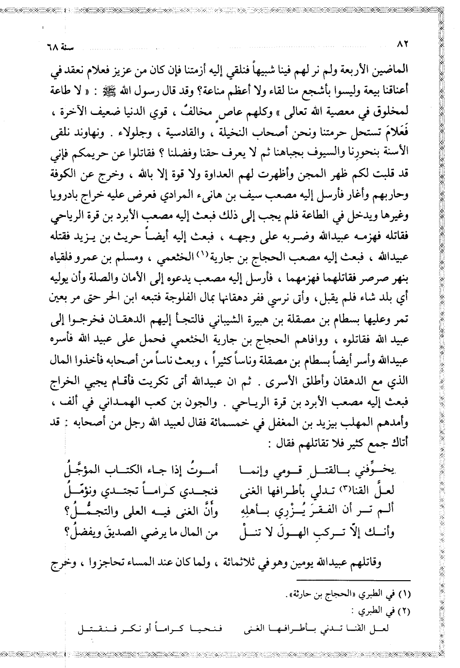 الماضين الأربعة ولم نر لهم فينا شبيها فنلقي إليه أزمتنا فإن كان من عزيز فعلام نعقد في أعناقنا بيعة وليسوا بأشجع منا لقاء ولا أعظم مناعة وقد قال رسول الله ( لا طاعة لمخلوق في معصية الله تعالى ) وكلهم عاص مخالف قوي الدنيا ضعيف الآخرة فعلام تستحل حرمتنا ونحن أصحاب النخيلة والقادسية وجلولاء ونهاوند نلقى الأسنة بنحورنا والسيوف بجباهنا ثم لا يعرف حقنا وفضلنا فقاتلوا عن حريمكم فإني قد قلبت لكم ظهر المجن وأظهرت لهم العداوة ولا قوة إلا بالله وخرج عن الكوفة وحاربهم وأغار فأرسل إليه مصعب سيف بن هانئ المرادي فعرض عليه خراج بادرويا وغيرها ويدخل في الطاعة فلم يجب إلى ذلك فبعث إليه مصعب الأبرد بن قرة الرياحي فقاتله فهزمه عبيد الله وضربه على وجهه فبعث إليه أيضا حريث بن يزيد فقتله عبيد الله فبعث إليه مصعب الحجاج بن جارية الخثعمي ومسلم بن عمرو فلقياه بنهر صرصر فقاتلهما فهزمهما فأرسل إليه مصعب يدعوه إلى الأمان والصلة وأن يوليه أي بلد شاء فلم يقبل وأتى نرسي ففر دهقانها بمال الفلوجة فتبعه ابن الحر حتى مر بعين تمر وعليها بسطام بن مصقلة بن هبيرة الشيباني فالتجأ إليهم الدهقان فخرجوا إلى عبيد الله فقاتلوه ووافاهم الحجاج بن جارية الخثعمي فحمل على عبيد الله فأسره عبيد الله وأسر أيضا بسطام بن مصقلة وناسا كثيرا وبعث ناسا من أصحابه فأخذوا المال الذي مع الدهقان وأطلق الأسرى ثم ان عبيد الله أتى تكريت فأقام يجبي الخراج فبعث إليه مصعب الأبرد بن قرة الرياحي والجون بن كعب الهمداني في ألف وأمدهم المهلب بيزيد بن المغفل في خمسمائة فقال لعبيد الله رجل من أصحابه قد أتاك جمع كثير فلا تقاتلهم فقال