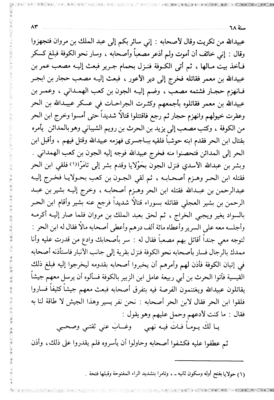 عبيد الله من تكريت وقال لأصحابه إني سائر بكم إلى عبد الملك بن مروان فتجهزوا وقال إني خائف أن أموت ولم أذعر مصعبا وأصحابه وسار نحو الكوفة فبلغ كسكر فأخذ بيت مالها ثم أتى الكوفة فنزل بحمام جرير فبعث إليه مصعب عمر بن عبيد الله بن معمر فقاتله فخرج إلى دير الأعور فبعث إليه مصعب حجار بن ابجر فانهزم حجار فشتمه مصعب وضم إليه الجون بن كعب الهمداني وعمر بن عبيد الله بن معمر فقاتلوه بأجمعهم وكثرت الجراحات في عسكر عبيد الله بن معمر فقاتلوه بأجمعهم وكثرت الجراحات في عسكر عبيد الله بن الحر وعقرت خيولهم وانهزم حجار ثم رجع فاقتتلوا قتالا شديدا حتى أمسوا وخرج ابن الحر من الكوفة وكتب مصعب إلى يزيد بن الحرث بن رويم الشيباني وهو بالمدائي يأمره بقتال ابن الحر فقدم ابنه حوشبا فلقيه بباجسرى فهزمه عبيد الله وقتل فيهم وأقبل ابن الحر إلى المدائن فتحصنوا منه فخرج عبيد الله فوجه إليه الجون بن كعب الهمداني وبشر بن عبد الله الأسدي فنزل الجون بحولايا وقدم بشر إلى تامرا فلقي ابن الحر فقتله ابن الحر وهزم أصحابه ثم لقي الجون بن كعب بحولايا فخرج إليه عبد الرحمن بن عبد الله فقتله ابن الحر وهزم أصحابه وخرج إليه بشير بن عبد الرحمن بن بشير العجلي فقاتله بسوراء قتالا شديدا فرجع عنه بشير وأقام ابن الحر بالسواد يغير ويجبي الخراج ثم لحق بعبد الملك بن مروان فلما صار إليه أكرمه وأجلسه معه على السرير وأعطاه مائة ألف درهم وأعطى أصحابه مالا فقال له ابن الحر لتوجه معي حندا أقاتل بهم مصعبا فقال له سر بأصحابك وادع من قدرت عليه وأنا ممدك بالرجال فسار بأصحابه نحو الكوفة فنزل بقربه إلى جانب الأنبار فاستأذنه أصحابه في إتيان الكوفة فأذن لهم وأمرهم أن يخبروا أصحابه بقدومه ليخرجوا إليه فبلغ ذلك القيسية فأتوا الحرث بن أبي ربيعة عامل ابن الزبير بالكوفة فسألوه أن يرسل معهم جيشا يقاتلون عبيد الله ويغتنمون الفرصة فيه بتفرق أصحابه فبعث معهم جيشا كثيفا فساروا فلقوا ابن الحر فقال لابن الحر أصحابه نحن نفر يسير وهذا الجيش لا طاقة لنا به فقال ما كنت لأدعهم وحمل عليهم هو يقول