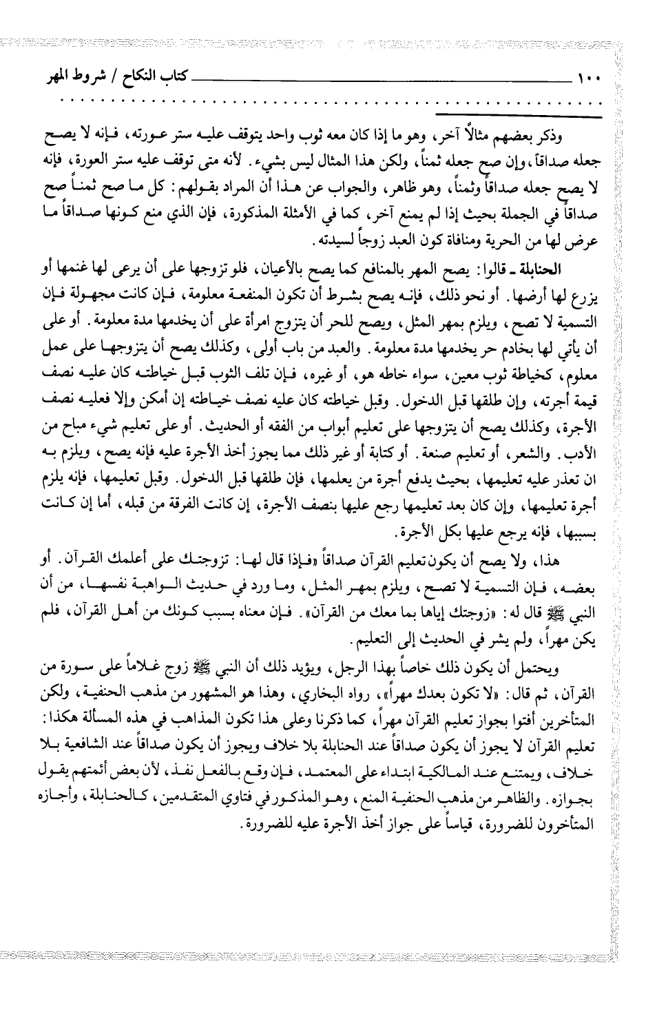 الحنابلة - قالوا: يصح المهر بالمنافع كما يصح بالأعيان، فلو تزوجها على أن يرعى لها غنمها أو يزرع لها أرضها. أو نحو ذلك، فإنه يصح بشرط أن تكون المنفعة معلومة، فإن كانت مجهولة فإن التسمية لا تصح، ويلزم بمهر المثل، ويصح للحر أن يتزوج امرأة على أن يخدمها مدة معلومة. أو على أن يأتي لها بخادم حر يخدمها مدة معلومة. والعبد من باب أولى، وكذلك يصح أن يتزوجها على عمل معلوم، كخياطة ثوب معين، سواء خاطه هو، أو غيره، فإن تلف الثوب قبل خياطته كان عليه نصف قيمة أجرته، وإن طلقها قبل الدخول. وقبل خياطته كان عليه نصف خياطته إن أمكن وإلا فعليه نصف الأجرة، وكذلك يصح أن يتزوجها على تعليم أبواب من الفقه أو الحديث. أو على تعليم شيء مباح من الأدب. والشعر، أو تعليم صنعة. أو كتابة أو غير ذلك مما يجوز أخذ الأجرة عليه فإنه يصح، ويلزم به إن تعذر عليه تعليمها، فإن طلقها قبل الدخول. وقبل تعليمها، فإنه يلزم أجرة تعليمها، وإن كان بعد تعليمها رجع عليها بنصف الأجرة، إن كانت الفرقة من قبله، أما إن كانت بسببها، فإنه يرجع عليها بكل الأجرة.
