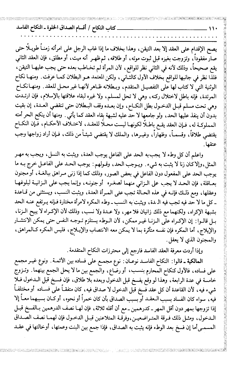يصح الإقدام على العقد إلا بعد التيقن، وهذا بخلاف ما إذا غاب الرجل على امرأته زمناً طويلاً حتى صار مفقوداً، وتزوجت بغيره قبل ثبوت موته، أو طلاقه، ثم ظهر أنه ميت، أو مطلق، فإن العقد الثاني يقع صحيحاً، وذلك لأنه في الثاني نظر للواقع، لأن المرأة لم تخاطب بعده حتى يجب عليها التيقن، فلذا نظر في جانبها للواقع بخلاف الأول كالثاني، ولكن المعتمد هو البطلان كما عرفت. ومنها نكاح الوثنية التي لا كتاب لها على التفصيل المتقدم، وبطلانه ظاهر لأنها غير محل للعقد.