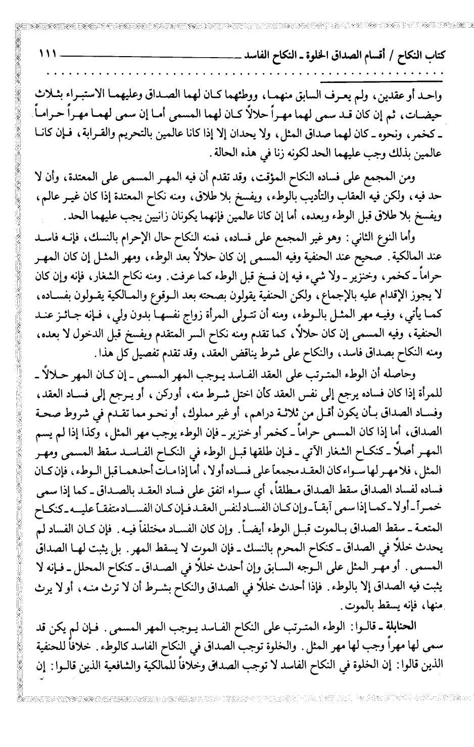 وحاصله أن الوطء المترتب على العقد الفاسد يوجب المهر المسمى - إن كان المهر حلالاً - للمرأة إن كان فساده يرجع إلى نفس العقد كأن اختل شرط منه، أو ركن، أو يرجع إلى فساد العقد، وفساد الصداق بأن يكون أقل من ثلاثة دراهم، أو غير مملك، أو نحو مما تقدم في شروط صحة الصداق، أما إذا كان المسمى حراماً - كخمر أو خنزير - فإن الوطء يوجب مهر المثل، وكذا إذا لم يسم المهر أصلاً - كنكاح الشغار الآتي - فإن طلقها قبل الوطء في النكاح الفاسد سقط المسمى ومهر المثل، فلا مهر لها سواء كان مجمعاً على فساده أو لا، أما إذا مات أحدهما قبل الوطء، فإن كان فساده لفساد الصداق سقط الصداق مطلقاً، أي سواء اتفق على فساد العقد بالصداق - كما إذا سمى خمراً - أو لا - كما إذا سمى آبقاً - وإن كان الفساد لنفس العقد فإن كان الفساد متفقاً عليه - كنكاح المتعة - سقط الصداق بالموت قبل الوطء أيضاً. وإن كان الفساد مختلفاً فيه. فإن كان الفساد لم يحدث خللاً في الصداق - كنكاح المحرم بالنسك - فإن الموت لا يسقط المهر. بل يثبت لها الصداق المسمى. أو مهر المثل على الوجه السابق وإن أحدث خللاً في الصداق - كنكاح المحلل - فإنه لا يثبت فيه الصداق إلا بالوطء. فإذا أحدث خللاً في الصداق والنكاح بشرط أن لا ترث منه، أو لا يرث منها، فإنه يسقط بالموت.