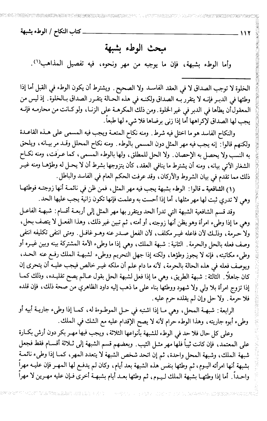 وقد قسم الشافعية الشبهة التي تدرأ الحد ويتقرر بها مهر المثل إلى أربعة أقسام: شبهة الفاعل وهي ما إذا وطئ امرأة وهو يظن أنها زوجته، أو أمته، ثم تبين غير ذلك، وهذا الفعل لا يتصف بحل، ولا حرمة، وذلك لأن فاعله غير مكلف، لأن الفعل صدر عنه وهو غافل. ومتى انتفى تكليفه انتفى وصف فعله بالحل والحرمة. الثانية: شبهة الملك، وهي إذا ما وطئ الأمة المشتركة بينه وبين غيره أو وطئ مكاتبته، فإنه لا يجوز وطئها، ولكنه إذا جهل التحريم ووطئ لشبهة الملك رفع عنه الحد، ويوصف فعله في هذه الحالة بالحرمة، لأنه ما دام علم أن ملكه غير خالص فيجب عليه أن يتحرى إن كان جاهلاً. الثالثة: شبهة الطريق، وهي ما إذا فعل لشبهة الحل بقول عالم يصح تقليده، وذلك كما إذا تزوج امرأة بلا ولي ولا شهود ووطئها بناء على ما ذهب إليه داود الظاهري من صحة ذلك، فإن قلده فلا حرمة، ولا حل وإن لم يقلده حرم عليه. الرابعة: شبهة المحل، وهي ما إذا اشتبه في حل الموطوءة له، كما إذا وطئ جارية أبيه أو وطئ أبوه جاريته، وهذا الوطء حرام لأن لا يصح الإقدام عليه مع الشك في الملك.