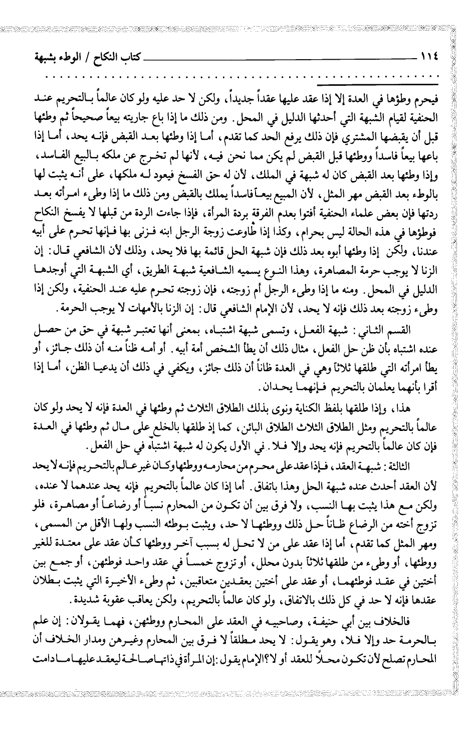 الثالثة: شبهة العقد، فإذا عقد على محرم من محارمه ووطئها وكان غير عالم بالتحريم فإنه لا يحد لأن العقد أحدث عنده شبهة وهذا باتفاق. أما إذا كان عالماً بالتحريم فإنه يحد عندهما لا عنده، ولكن مع هذا يثبت بها النسب، ولا فرق بين أن تكون من المحارم نسباً أو رضاعاً أو مصاهرة، فلو تزوج أخته من الرضاع ظاناً حل ذلك ووطئها لا حد، ويثبت بوطئه النسب ولها الأقل من المسمى، ومهر المثل كما تقدم، أما إذا عقد على من لا تحل له بسبب آخر ووطئها كأن عقد على معتدة للغير ووطئها، أو وطئ من طلقها ثلاثاً بدون محلل، أو تزوج خمساً في عقد واحد فوطئهن، أو جمع بين أختين في عقد فوطئهما، أو عقد على أختين بعقدين متعاقبين، ثم وطئ الأخيرة التي يثبت بطلان عقدها فإنه لا حد في كل ذلك بالاتفاق، ولو كان عالماً بالتحريم، ولكن يعاقب عقوبة شديدة.