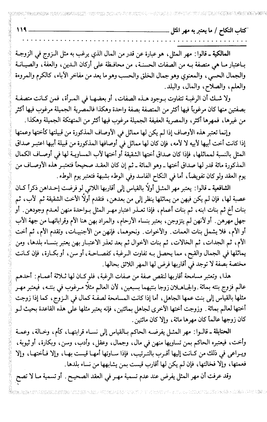 الحنابلة - قالوا: مهر المثل يفرضه الحاكم بالقياس إلى نساء قرابتها، كأم، وخالة، وعمة وأخت، فيعتبره الحاكم بمن تساويها منهن في مال، وجمال، وعقل، وأدب، وسن، وبكارة، أو ثيوبة، ويراعى في ذلك من كانت إليها أقرب بالترتيب، فإذا ساوتها أمها قيست بها وإلا فأختها، وإلا فعمتها، وإلا فخالتها، فإن لم يكن لها أقارب قيست بمن يشابهها من نساء بلدها.