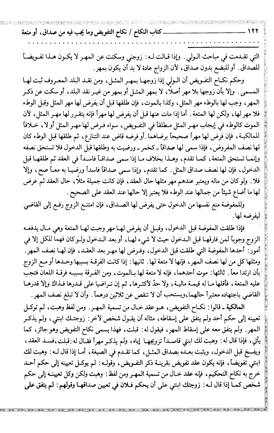 المالكية - قالوا: نكاح التفويض، هو عقد خالي من تسمية المهر. ومن لفظ وهبت، لم توكل تعيينه إلى حكم أحد ولم يتفق على إسقاطه، مثاله أن يقول شخص لآخر: زوجتك ابنتي، ولم يذكر المهر. ولم يتفق معه على إسقاط المهر، فيقول له: قبلت، فهذا يسمى نكاح التفويض وهو جائز، كما يأتي، فإذا قال له: وهبت لك ابنتي قاصداً تزويجها إياه، ولم يذكر مهراً فقال له: قبلت، فسد العقد، ويفسخ قبل الدخول، ويثبت بعده بصداق المثل، كما تقدم في الصيغة، أما إذا قال له: وهبت لك ابنتي تفويضاً، فإنه يكون عقد تفويض بقرينة ذكر التفويض، وقوله: لم يوكل تعيينه إلى حكم أحد خرج به نكاح التحكيم، فإنه عقد خال من تسمية المهر ومن لفظ: وهبت ولكن وكل تعيينه إلى حكم شخص كما إذا قال له: زوجتك ابنتي على أن يحكم فلان في تعيين صداقها وقولهم: لم يتفق على