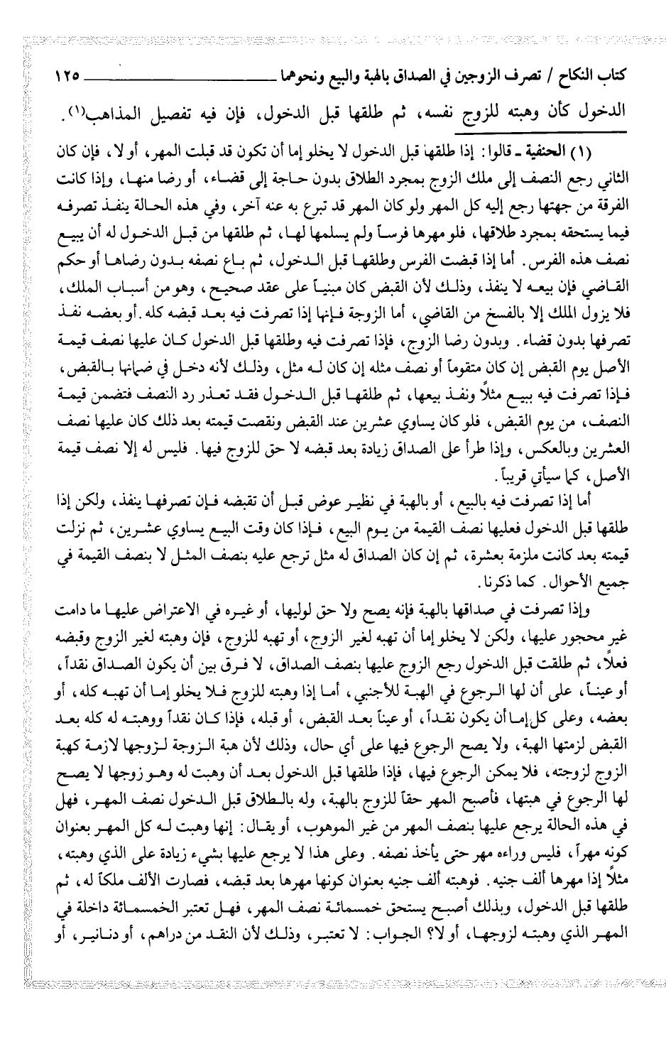 وإذا تصرفت في صداقها بالهبة فإنه يصح ولا حق لوليها، أو غيره في الاعتراض عليها مادامت غير محجور عليها، ولكن لا يخلو إما أن تهبه لغير الزوج، أو تهبه للزوج، فإن وهبته لغير الزوج وقبضه فعلاً، ثم طلقت قبل الدخول رجع الزوج عليها بنصف الصداق، لا فرق بين أن يكون الصداق نقداً، أو عيناً، على أن لها الرجوع في الهبة للأجنبي، أما إذا وهبته للزوج فلا يخلو إما أن تهبه كله، أو بعضه، وعلى كل إما أن يكون نقداً، أو عيناً بعد القبض، أو قبله، فإذا كان نقداً ووهبته له كله بعد القبض لزمتها الهبة، ولا يصح الرجوع فيها على أي حال، وذلك لأن هبة الزوجة لزوجها لازمة كهبة الزوج لزوجته، فلا يمكن الرجوع فيها، فإذا طلقها قبل الدخول بعد أن وهبت له وهو زوجها لا يصح لها الرجوع في هبتها، فأصبح المهر حقاً للزوجة بالهبة، وله بالطلاق قبل الدخول نصف المهر، فهل في هذه الحالة يرجع عليها بنصف المهر من غير الموهوب، أو يقال: إنها وهبت له كل المهر بعنوان كونه مهراً، فليس وراءه مهر حتى يأخذ نصفه. وعلى هذا لا يرجع عليها بشيء زيادة على الذي وهبته، مثلاً إذا مهرها ألف جنيه. فوهبته ألف جنيه بعنوان كونها مهرها بعد قبضه، فصارت الألف ملكاً له، ثم طلقها قبل الدخول، وبذلك أصبح يستحق خمسمائة نصف المهر، فهل تعتبر الخمسمائة داخلة في المهر الذي وهبته لزوجها، أو لا؟ الجواب: لا تعتبر، وذلك لأن النقد من دراهم، أو دنانير، أو