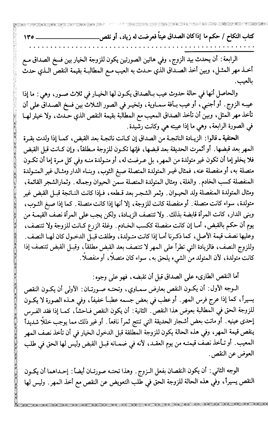 الحنفية - قالوا: الزيادة الناتجة من الصداق إن كانت ناتجة بعد النقص، كما إذا ولدت بقرة المهر بعد قبضها. أو أثمرت الحديقة بعد قبضها، فإنها تكون للزوجة مطلقاً، وإن كانت قبل القبض فلا يخلو إما أن تكون غير متولدة من المهر، بل عرضت له، أو متولدة منه وفي كل مرة إما أن تكون متصلة به، أو منفصلة عنه، فمثال غير المتولدة المتصلة صبغ الثوب، وبناء الدار ومثال غير المتولدة المنفصلة كسب الخادم. والغلة، ومثال المتولدة المتصلة سمن الحيوان وجماله. وثمار الشجر القائمة، ومثال المتولدة المنفصلة ولد الحيوان. وثمر الشجر بعد قطعه، فإذا كانت الناتجة قبل القبض غير متولدة، سواء كانت متصلة. أو منفصلة كانت للزوجة، إلا أنها إذا كانت متصلة. كما إذا صبغ الثوب، وبنى الدار، كانت المرأة قابضة بذلك. ولا تتنصف الزيادة، ولكن يجب على المرأة نصف القيمة من يوم أن حكم بالقبض، أما إن كانت منفصلة ككسب الخادم. وغلة الزرع كانت للزوجة ولا تتنصف، وعليها نصف قيمة الأصل، كما ذكرنا أما إذا كانت متولدة، وطلقت قبل الدخول كان لها النصف. وللزوج النصف، فالزيادة التي تطرأ على المهر لا تتنصف بعد القبض مطلقاً، وقبل القبض تتنصف إذا كانت متولدة، لأن المتولدة من الشيء يلحق به، سواء كان متصلاً، أو منفصلاً.