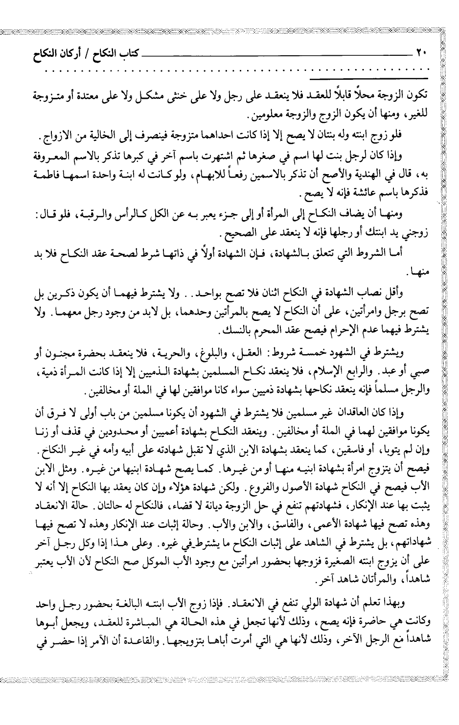 ويشترط في الشهود خمسة شروط: العقل، والبلوغ، والحرية، فلا ينعقد بحضرة مجنون أو صبى أو عبد. والرابع الإسلام، فلا ينعقد نكاح المسلمين بشهادة الذميين إلا إذا كانت المرأة ذمية. والرجل مسلماً فإنه ينعقد نكاحها بشهادة ذميين سواء كانا موافقين لها في الملة أو مخالفين.