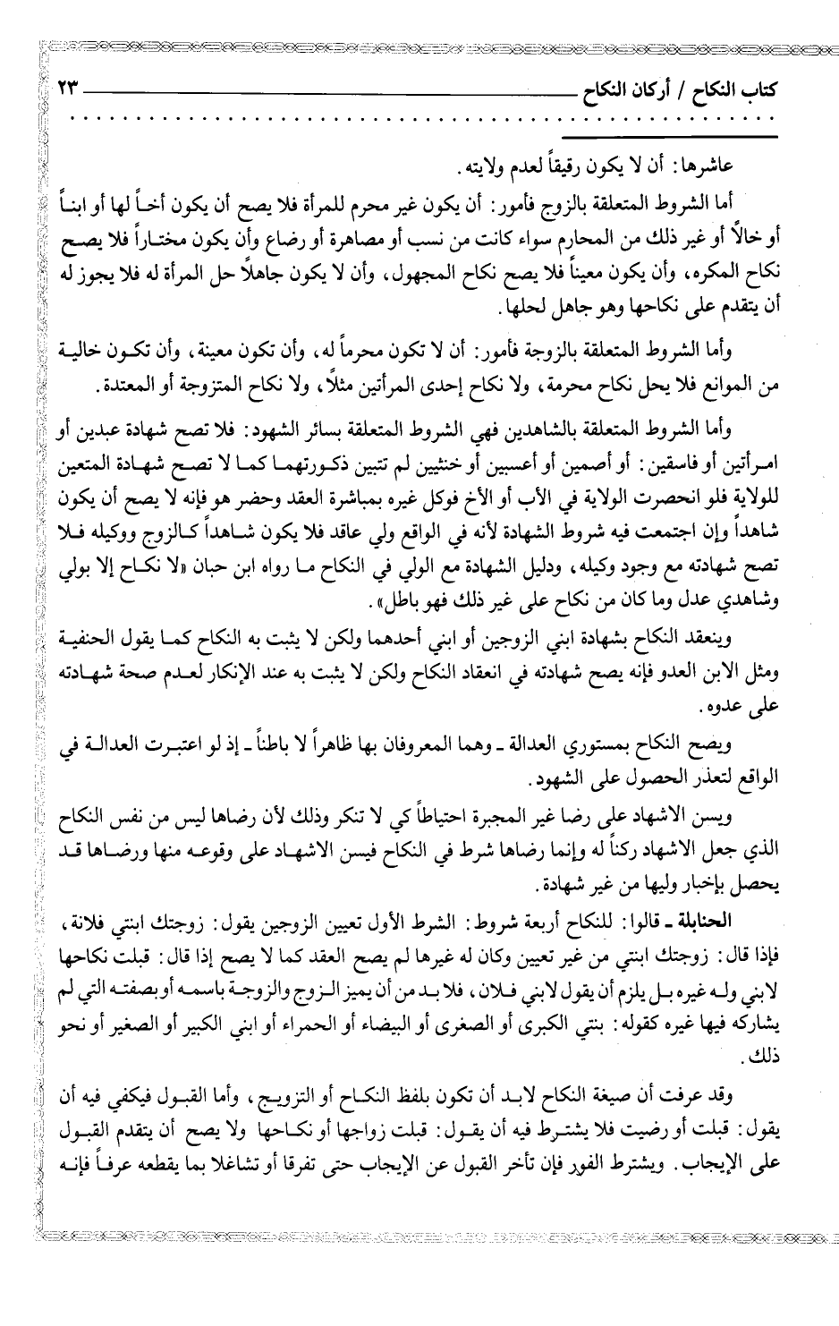 الحنابلة - قالوا: للنكاح أربعة شروط: الشرط الأول تعيين الزوجين يقول: زوجتك ابنتي فلانة، فإذا قال: زوجتك ابنتي بغير تعيين وكان له غيرها لم يصح إذا قال: قبلت نكاحها لابني وله غيره بل يلزم أن يقول لابني فلان، فلا بد من أن يميز الزوج والزوجة باسمه أو بصفته التي لم يشاركه فيها غيره كقوله: بنتي الكبرى أو الصغرى أو البيضاء أو الحمراء أو ابني الكبير أو الصغير أو نحو ذلك.