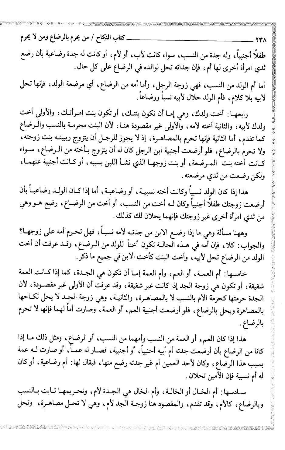 خامسها: أم العمة، أو العم، وأم العمة إما أن تكون هي الجدة، كما إذا كانت العمة شقيقة، أو تكون هي زوجة الجد إذا كانت غير شقيقة، وقد عرفت أن الأولى غير مقصودة، لأن الجدة حرمتها كحرمة الأم بالنسب لا بالمصاهرة، والثانية، وهي زوجة الجد لا يحل نكاحها بالمصاهرة ويحل بالرضاع، فلو أرضعت أجنبية العم، أو العمة، وصارت أماً لهما فإنها لا تحرم بالرضاع.
