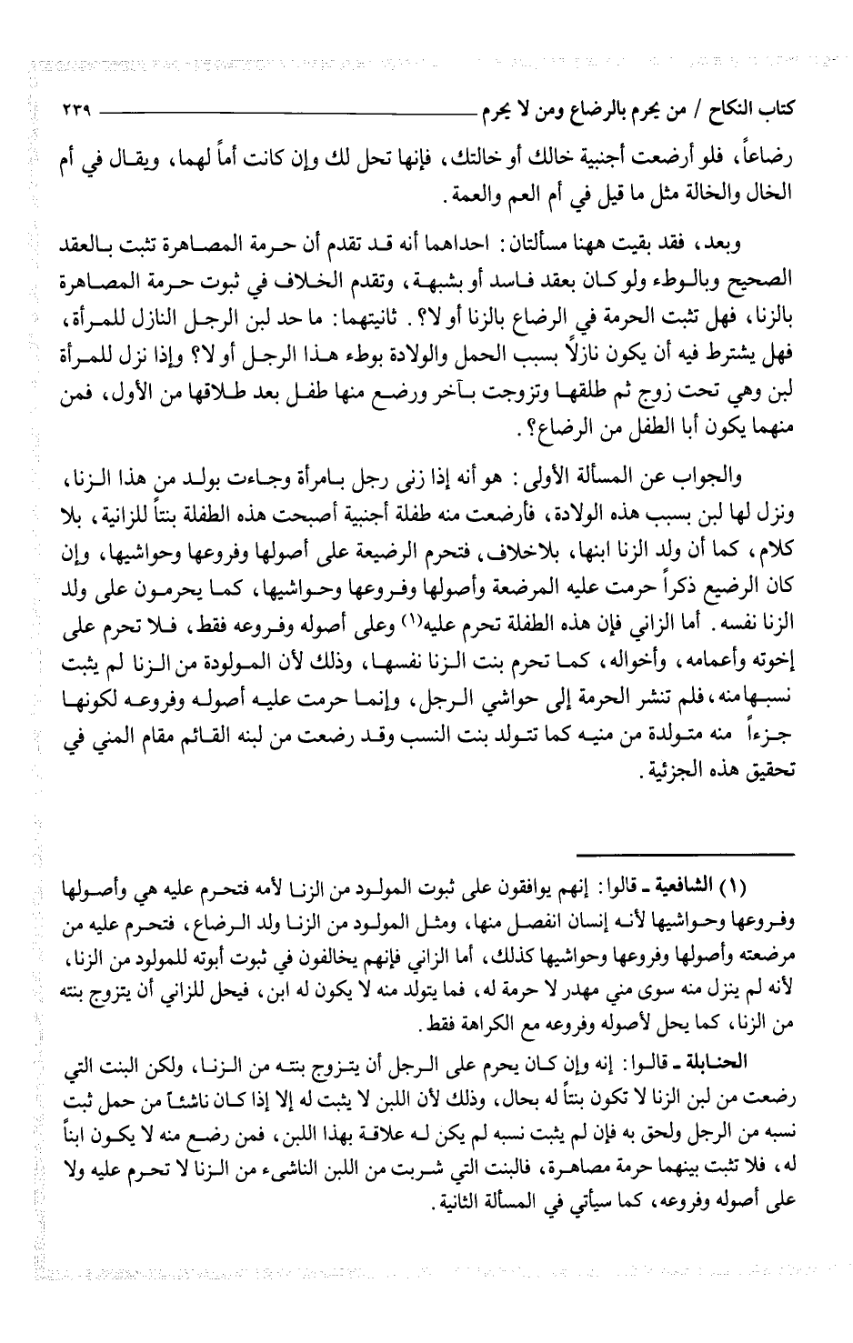 (¬1) (الشافعية - قالوا: إنهم يوافقون على ثبوت المولود من الزنا لأمه فتحرم عليه هي وأصولها وفروعها وحواشيها لأنه إنسان انفصل منها، مثل المولود من الزنا ولد الرضاع، فتحرم عليه من مرضعته وأصولها وفروعها وحواشيها كذلك، أما الزاني فإنهم يخالفون في ثبوت أبوته للمولود من الزنا، لأنه لم ينزل منه سوى مني مهدر لا حرمة له، فما يتولد منه لا يكون له ابن، فيحل للزاني أن يتزوج بنته من الزنا، كما يحل لأصوله وفروعه مع الكراهة فقط.