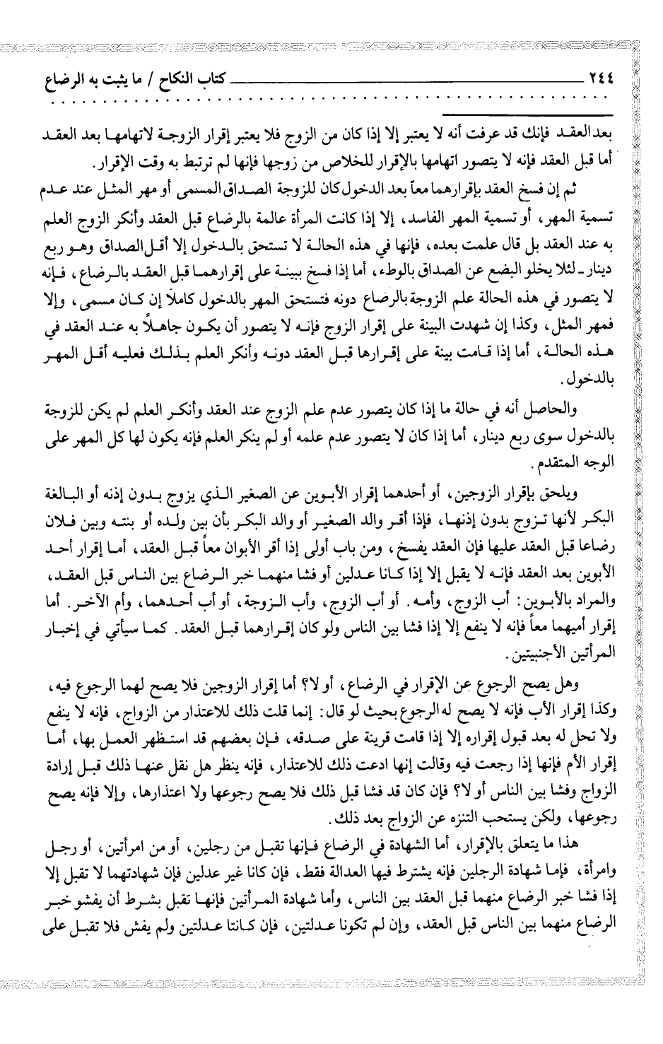 وهل يصح الرجوع عن الإقرار في الرضاع، أولا؟ أما إقرار الزوجين فلا يصح لهما الرجوع فيه، وكذا إقرار الأب فإنه لا يصح له الرجوع بحيث لو قال: إنما قلت ذلك للاعتذار من الزوج، فإنه لا ينفع ولا تحل له بعد قبول إقراره إلا إذا قامت قرينة على صدقه، فإن بعضهم قد استظهر العمل بها، أما إقرار الأم فإنها إذا رجعت فيه وقالت إنها ادعت ذلك للاعتذار، فإنه ينظر هل نقل عنها ذلك قبل إرادة الزواج وفشا بين الناس أو لا؟ فإن كان قد فشا قبل ذلك فلا يصح رجوعها ولا اعتذارها، وإلا فإنه يصح رجوعها، ولكن يستحب التنزه عن الزواج بعد ذلك.