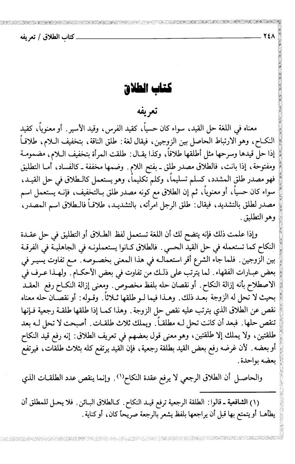 وإذا علمت ذلك فإنه يتضح لك أن اللغة تستعمل لفظ الطلاق أو التطليق في حل عقدة النكاح كما تستعمله في حل القيد الحسي. فالطلاق كانوا يستعملونه في الجاهلية في الفرقة بين الزوجين. فلما جاء الشرع أقر استعماله في هذا المعنى بخصوصه. مع تفاوت يسير في بعض عبارات الفقهاء. لما يترتب على ذلك من تفاوت في بعض الأحكام. ولهذا عرف في الاصطلاح بأنه إزالة النكاح. أو نقصان حله بلفظ مخصوص. ومعنى إزالة النكاح رفع العقد بحيث لا تحل له الزوجة بعد ذلك. وهذا فيما لو طلقها ثلاثاً. وقوله: أو نقصان حله معناه نقص عن الطلاق الذي يترتب عليه نقص حل الزوجة. وهذا كما إذا طلقها طلقة رجعية فإنها تنقص حلها. فبعد أن كانت تحل له مطلقاً. ويملك ثلاث طلقات. أصبحت لا تحل له بعد طلقتين، ولا يملك إلا طلقتين، وهو معنى قول بعضهم في تعريف الطلاق: إنه رفع قيد النكاح أو بعضه، لأن غرضه رفع بعض القيد بطلقة رجعية، فإن القيد يرتفع كله بثلاث طلقات، فيرتفع بعضه بواحدة.