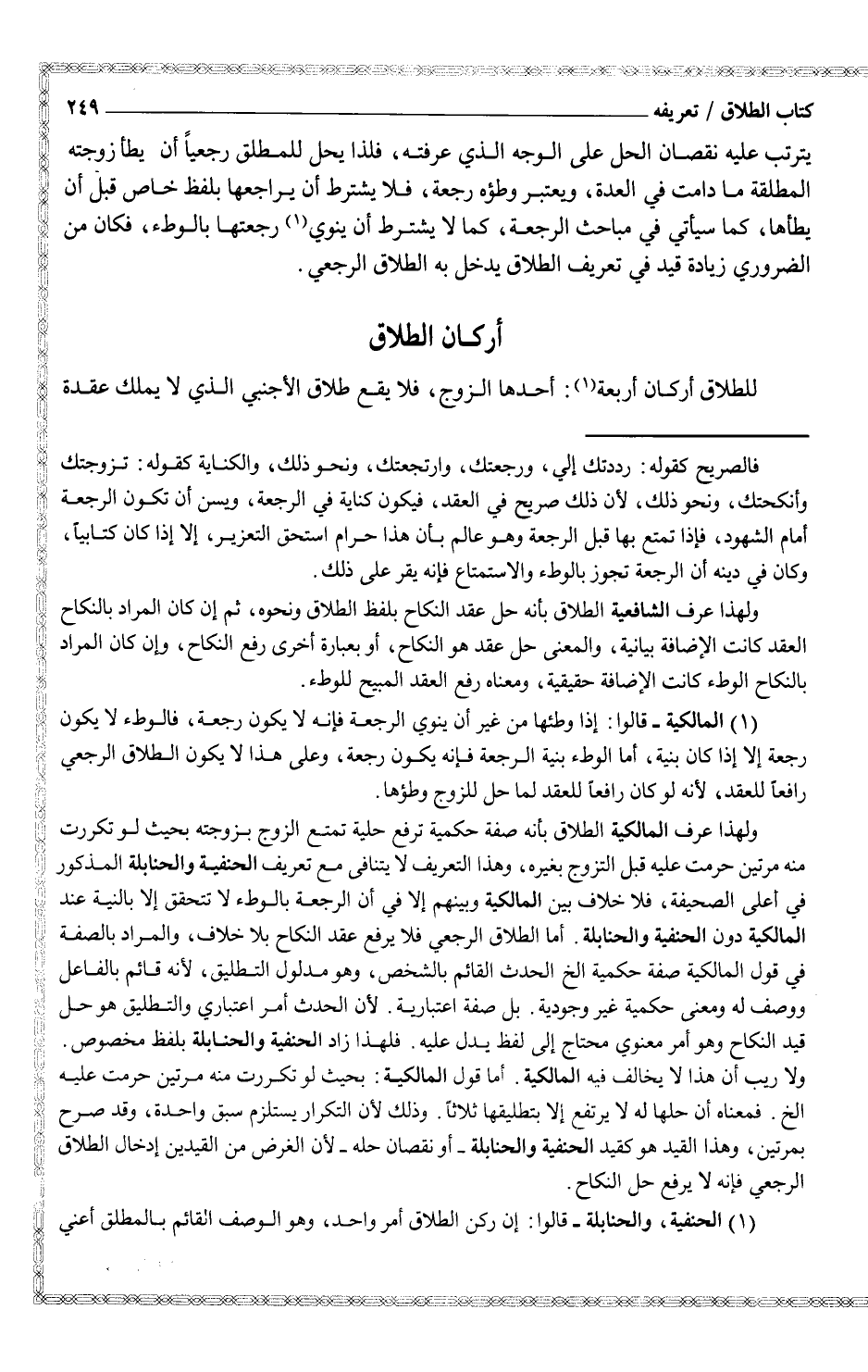 ولهذا عرف المالكية الطلاق بأنه صفة حكمية ترفع حلية تمتع الزوج بزوجته بحيث لو تكررت منه مرتين حرمت عليه قبل التزوج بغيره، وهذا التعريف لا يتنافى مع تعريف الحنفية والحنابلة المذكور في أعلى الصحيفة، فلا خلاف بين المالكية وبينهم إلا في أن الرجعة بالوطء لا تتحقق إلا بالنية عند المالكية دون الحنفية والحنابلة. أما الطلاق الرجعي فلا يرفع عقد النكاح بلا خلاف، والمراد بالصفة في قول المالكية صفة حكمية الخ الحدث القائم بالشخص، وهو مدلول التطليق، لأنه قائم بالفاعل ووصف له ومعنى حكمية غير وجودية. بل صفة اعتبارية. لأن الحدث أمر اعتباري والتطليق هو حل قيد النكاح وهو أمر معنوي محتاج إلى لفظ يدل عليه. فلهذا زاد الحنفية والحنابلة بلفظ مخصوص. ولا ريب أن هذا لا يخالف فيه المالكية. أما قول المالكية. بحيث لو تكررت منه مرتين حرمت عليه الخ. فمعناه أن حلها له لا يرتفع إلا بتطليقها ثلاثاً. وذلك لأن التكرار يستلزم سبق واحدة، وقد صرح بمرتين، وهذا القيد هو كقيد الحنفية والحنابلة - أو نقصان حله - لأن الغرض من القيدين إدخال الطلاق الرجعي فإنه لا يرفع حل النكاح) .