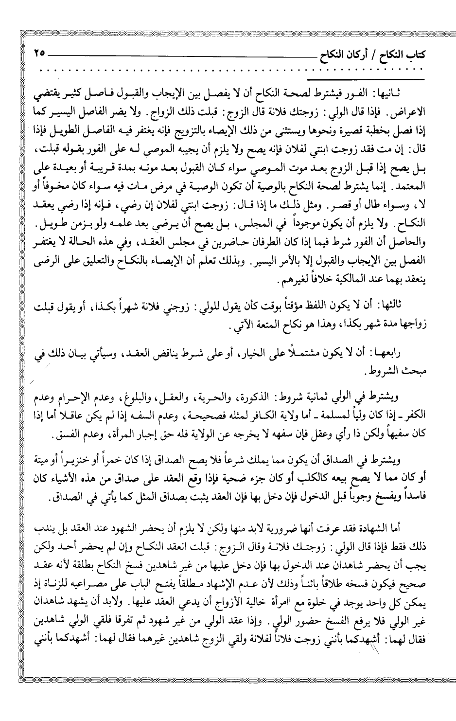 ثانيها: الفور فيشترط لصحة النكاح أن لا يفصل بين الإيجاب والقبول فاصل كثير يقتضي الاعراض. فإذا قال الولي: زوجتك فلانة قال الزوج: قبلت ذلك الزواج. ولا يضر الفاصل اليسير كما إذا فصل بخطبة قصيرة ونحوها ويستثنى من ذلك الإيصاء بالتزويج فإنه يغتفر فيه الفاصل الطويل فإذا قال: إن مت زوجت ابنتي لفلان فإنه يصح ولا يلزم أن يجيبه الموصى له على الفور بقوله قبلت، بل يصح إذا قبل الزوج بعد موت الموصي سواء كان القبول بعد موته بمدة قريبة أو بعيدة على المعتمد. إنما يشترط لصحة النكاح بالوصية أن تكون الوصية في مرض مات فيه سواء كان مخوفاً أولا، وسواء طال أو قصر. ومثل ذلك ما إذا قال: زوجت ابنتي لفلان إن رضي، فإنه إذا رضي يعقد النكاح. ولا يلزم أن يكون موجوداً في المجلس، بل يصح أن يرضى بعد علمه ولو بزمن طويل. والحاصل أن الفور شرط فيما إذا كان الطرفان حاضرين في مجلس العقد، وفي هذه الحالة لا يغتفر الفصل بين الإيجاب والقبول إلا بالأمر اليسير. وبذلك تعلم أن الإيصاء بالنكاح والتعليق على الرضى ينعقد بهما عند المالكية خلافاً لغيرهم.