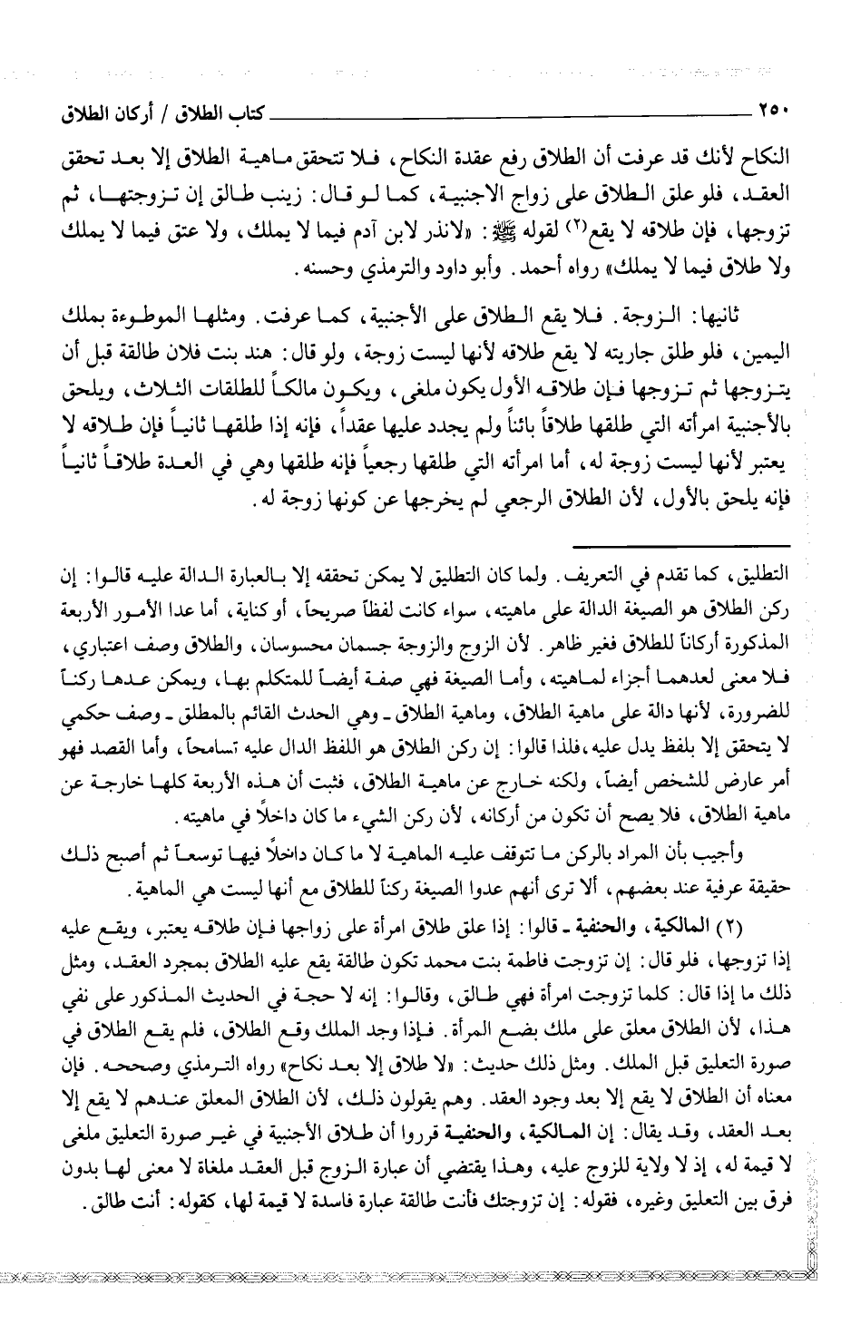 (¬1) (المالكية، الحنفية - قالوا: إذا علق طلاق امرأة على زوجها فإن طلاقه يعتبر، ويقع عليه إذا تزوجها، فلو قال: إن تزوجت فاطمة بنت محمد تكون طالقة يقع عليه الطلاق بمجرد العقد، ومثل ذلك ما إذا قال: كلما تزوجت امرأة فهي طالق، وقالوا: إنه لا حجة في الحدث المذكور على نفي هذا، لأن الطلاق معلق على ملك بضع المرأة. فإذا وجد الملك وقع الطلاق، فلم يقع الطلاق في صورة التعليق قبل الملك. ومثل ذلك حديث: "لا طلاق إلا بعد النكاح" رواه الترمذي وصححه. فإن معناه أن الطلاق لا يقع إلا بعد وجود العقد. وهم يقولون ذلك، لأن الطلاق المعلق عندهم لا يقع إلا بعد العقد، وقد يقال: إن المالكية، والحنفية قرروا أن طلاق الأجنبية في غير صورة التعليق ملغى لا قيمة له، إذ لا ولاية للزوج عليه، وهذا يقتضي أن عبارة الزوج قبل العقد ملغاة لا معنى لها بدون فرق بين التعليق وغيره، فقوله: إن تزوجتك فأنت طالقة عبارة فاسدة لا قيمة لها، كقوله: أنت طالق) .