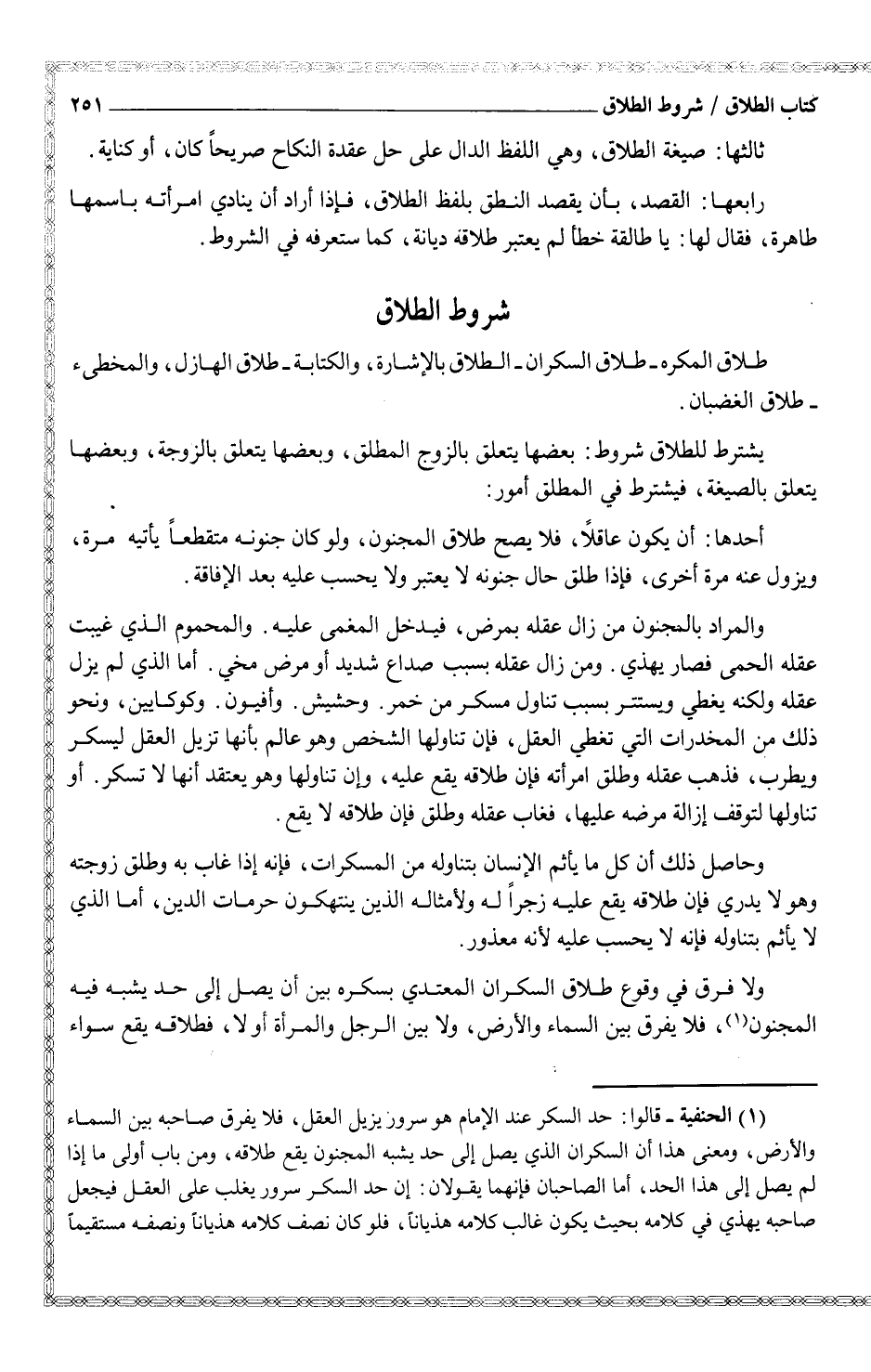 (¬1) (الحنفية - قالوا: حد السكر عند الإمام هو سرور يزيل العقل، فلا يفرق صاحبه بين السماء والأرض، ومعنى هذا أن السكران الذي يصل إلى حد يشبه المجنون يقع طلاقه، ومن باب أولى ما إذا لم يصل إلى هذا الحد، أما الصاحبان فإنهما يقولان: إن حد السكر سرور يغلب على العقل فيجعل صاحبه يهذي في كلامه بحيث يكون غالب كلامه هذياناً، فلو كان نصف كلامه هذياناً ونصفه مستقيماً