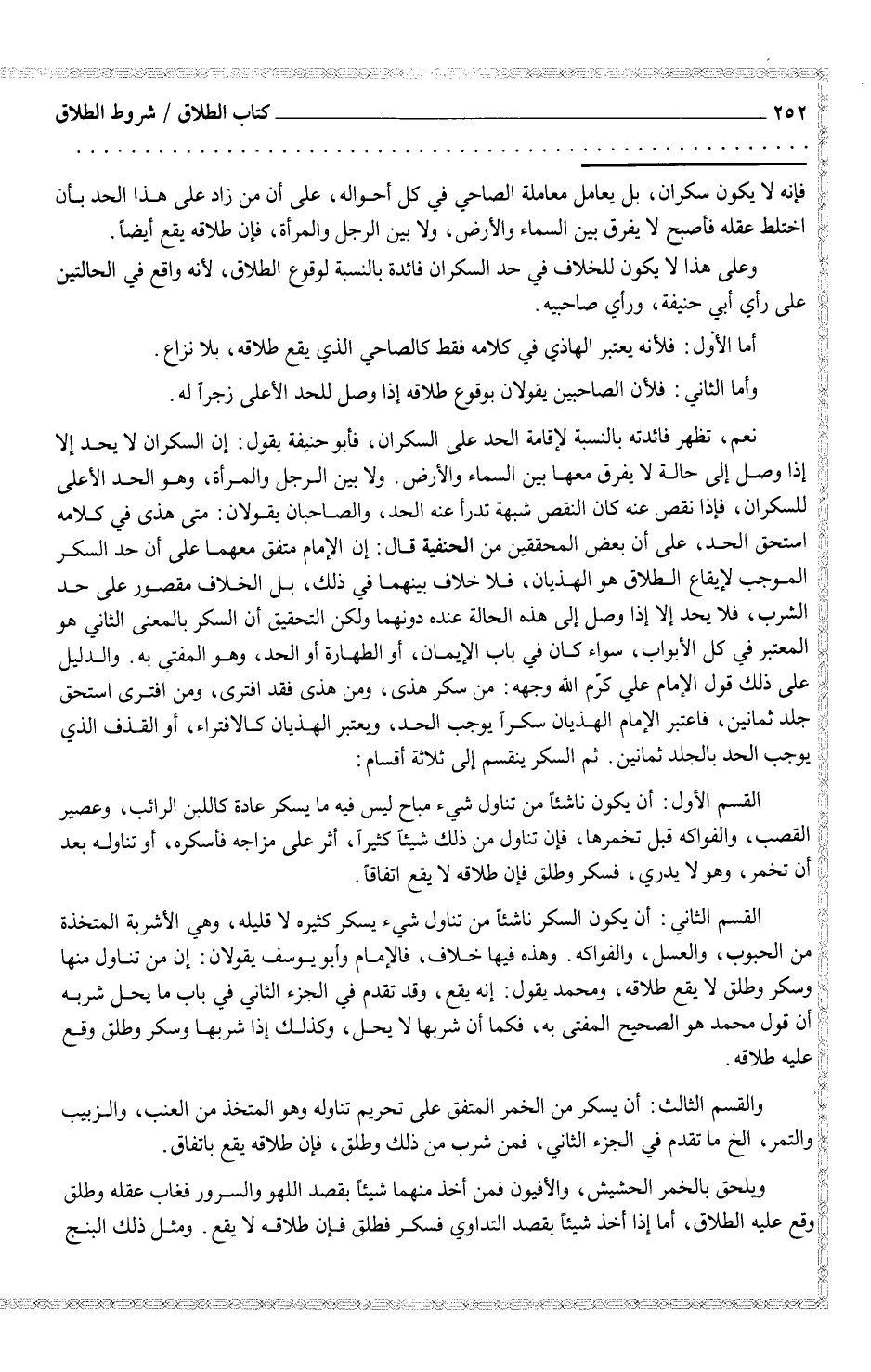 القسم الثاني: أن يكون السكر ناشئاً من تناول شيء يسكر كثيره لا قليله، وهي الأشربة المتخذة من الحبوب، والعسل، والفواكه. وهذه فيها خلاف، فالإمام وأبو يوسف يقولان: إن من تناول منها وسكر وطلق لا يقع طلاقه، ومحمد يقول: إنه يقع، وقد تقدم في الجزء الثاني في باب ما يحل شربه أن قول محمد هو الصحيح المفتى به، فكما أن شربها لا يحل، وكذلك إذا شربها وسكر وطلق وقع عليه طلاقه.