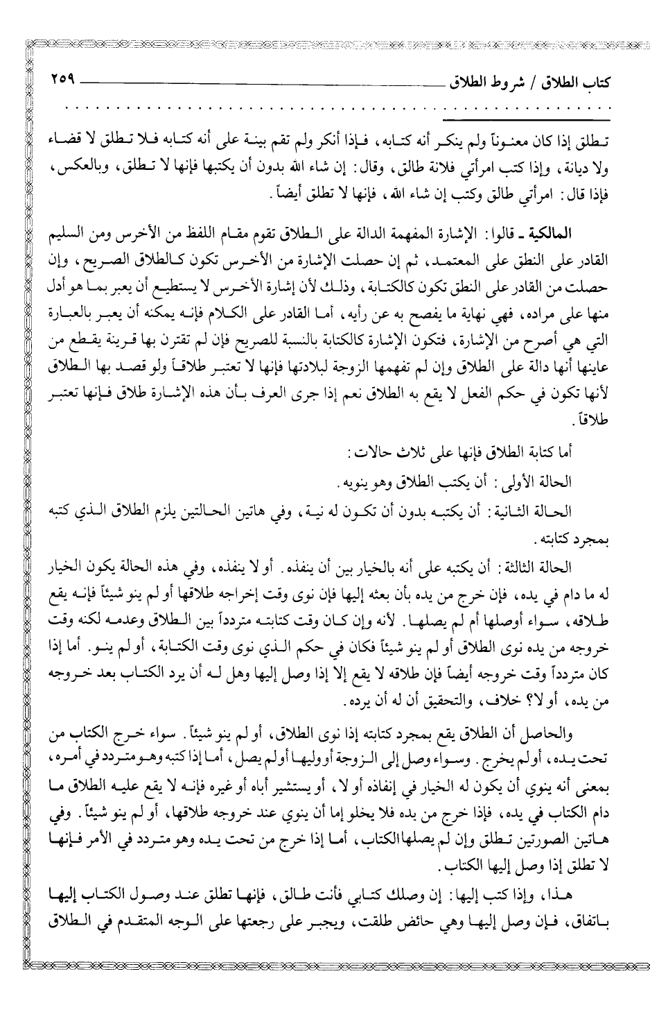 الحالة الثالثة: أن يكتبه على أنه بالخيار بين أن ينفذه. أو لا ينفذه، وفي هذه الحالة يكون الخيار له ما دام في يده، فإن خرج من يده بأن بعثه إليها فإن نوى وقت إخراجه طلاقها أو لم ينو شيئاً فإنه يقع طلاقه، سواء أو صلها أم لم يصلها. لأنه وإن كان وقت كتابته متردداً بين الطلاق وعدمه لكنه وقت خروجه من يده نوى الطلاق أو لم ينو شيئاً فكان في حكم الذي نوى وقت الكتابة، أو لم ينو. أما إذا كان متردداً وقت خروجه أيضاً فإن طلاقه لا يقع إلا إذا وصل إليها وهل له أن يرد الكتاب بعد خروجه من يده، أو لا؟ خلاف، والتحقيق أن له أن يرده.