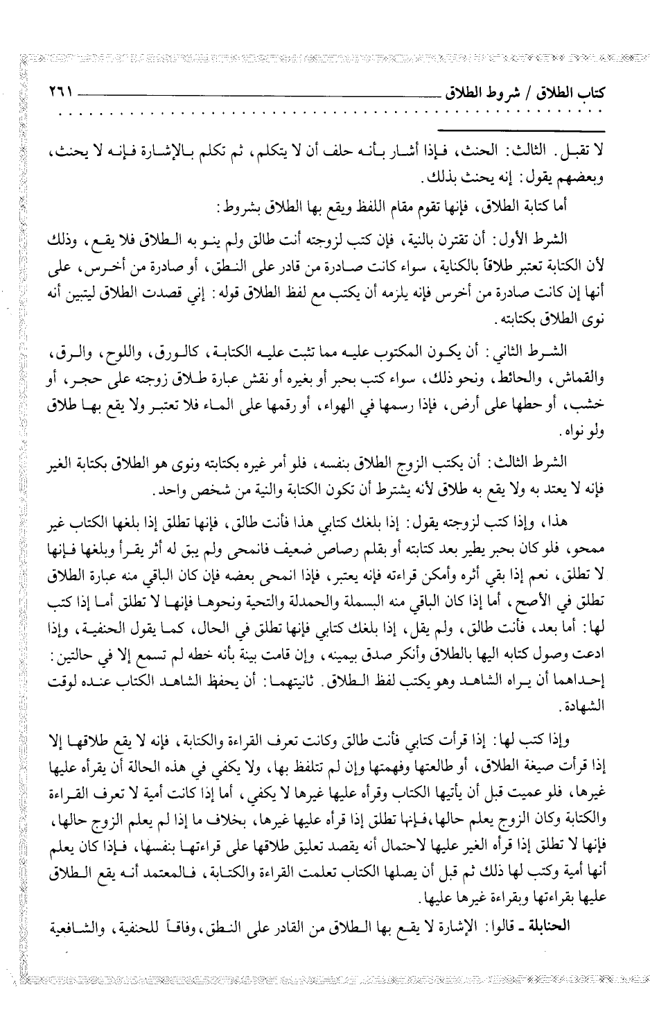 هذا، وإذا كتب لزوجته يقول: إذا بلغك كتابي هذا فأنت طالق، فإنها تطلق إذا بلغها الكتاب غير ممحو، فلو كان بحبر يطير بعد كتابته أو بقلم رصاص ضعيف فانمحى ولم يبق له أثر يقرأ وبلغها فإنها لا تطلق، نعم إذا بقي أثره وأمكن قراءته فإنه يعتبر، فإذا انمحى بعضه فإن كان الباقي منه عبارة الطلاق تطلق في الأصح، أما إذا كان الباقي منه البسملة والحمدلة والتحية ونحوها فإنها لا تطلق أما إذا كتب لها: أما بعد، فأنت طالق، ولم يقل، إذا بلغك كتابي فإنها تطلق بالحال، كما يقول الحنفية، وإذا ادعت وصول كتابه إليها بالطلاق وأنكر صدق بيمينه، وإن قامت بينة بأنه خطه لم تسمع إلا في حالتين: إحداهما أن يراه الشاهد وهو يكتب لفظ الطلاق. ثانيتهما: أن يحفظ الشاهد الكتاب عنده لوقت الشهادة.