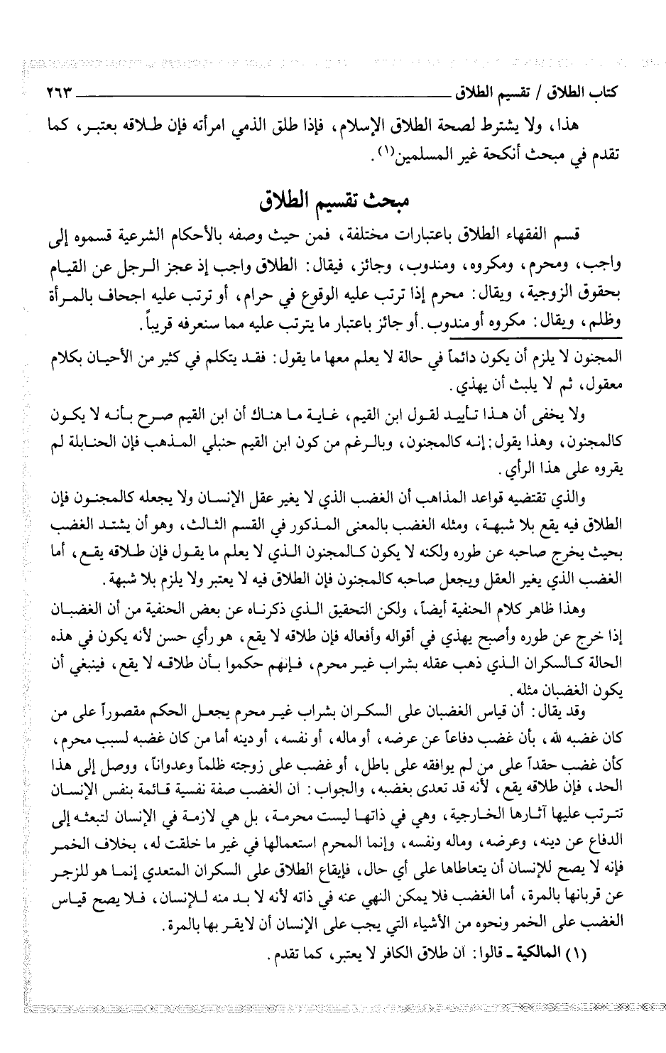 -قسم الفقهاء الطلاق باعتبارات مختلفة، فمن حيث وصفه بالأحكام الشرعية قسموه إلى واجب، ومحرم، ومكروه، ومندوب، وجائز، فيقال: الطلاق واجب إذ عجز الرجل عن القيام بحقوق الزوجية، ويقال: محرم إذا ترتب عليه الوقوع في حرام، أو تربت عليه اجحاف بالمرأة وظلم، ويقال: مكروه أو مندوب. أو جائز باعتبار ما يترتب عليه مما سنعرفه قريباً.