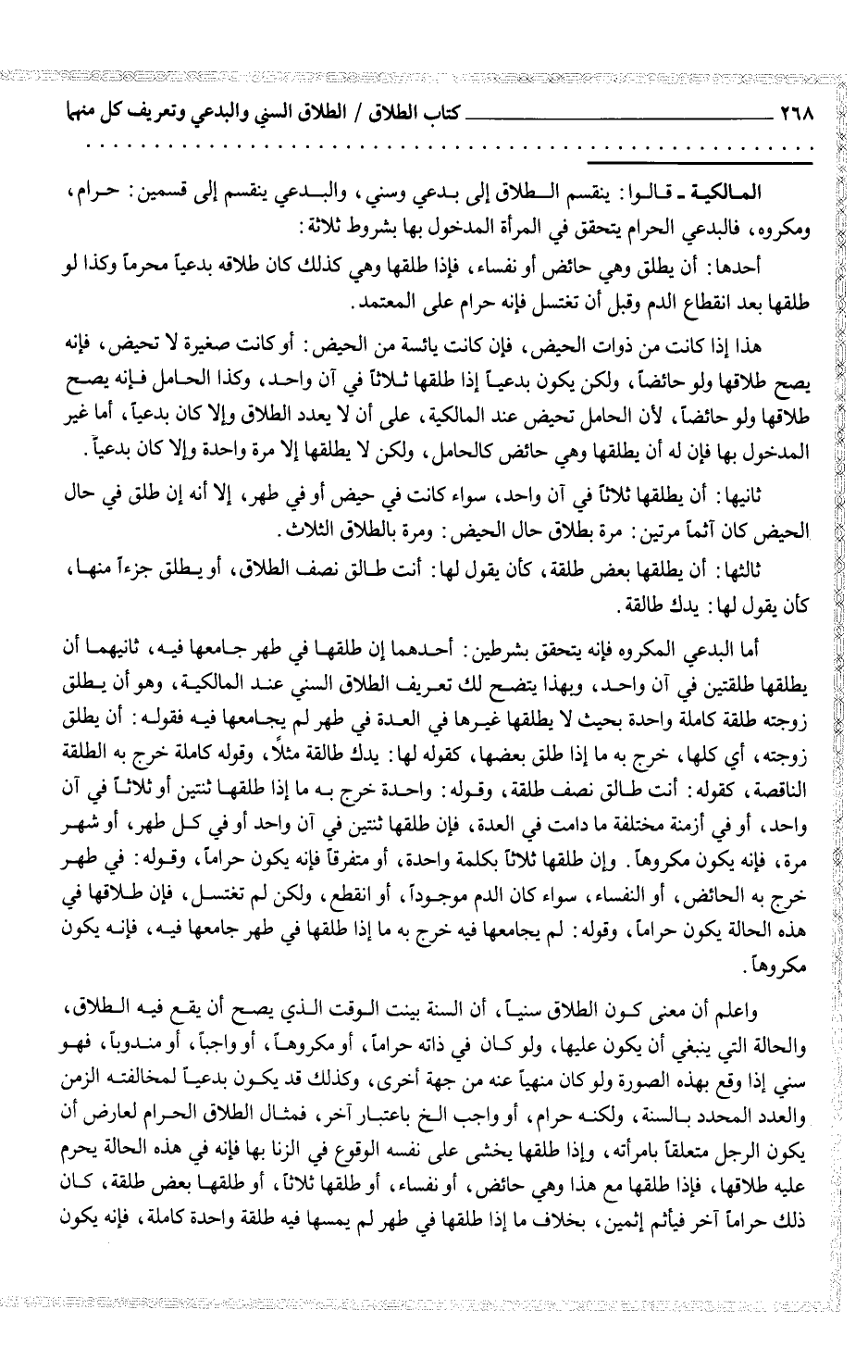 المالكية - قالوا: ينقسم الطلاق إلى بدعي وسني، والبدعي ينقسم إلى قسمين: حرام، ومكروه، فالبدعي الحرام يتحقق في المرأة المدخول بها بشروط ثلاثة: