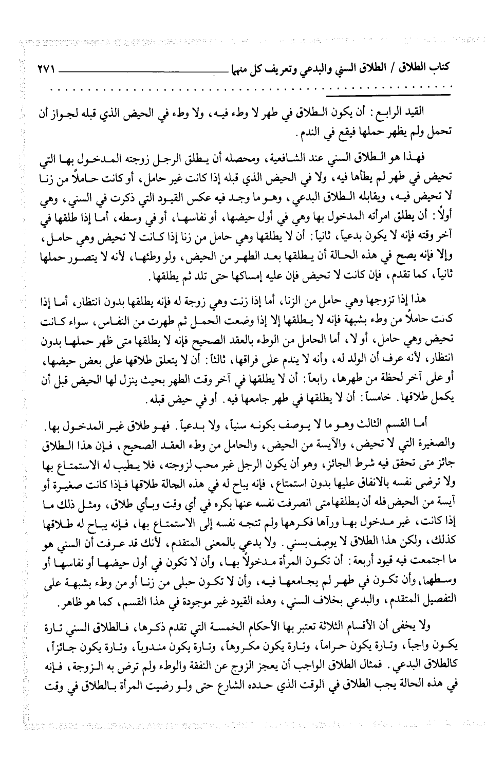 فهذا هو الطلاق السني عند الشافعية، ومحصله أن يطلق الرجل زوجته المدخول بها التي تحيض في طهر لم يطأها فيه، ولا في الحيض الذي قبله إذا كانت غير حامل، أو كانت حاملاً من الزنا لا تحيض فيه، ويقابله الطلاق البدعي، وهو ما وجد فيه عكس القيود التي ذكرت في السني، وهي أولاً: أن يطلق امرأته المدخول بها وهي في أول حيضها، أو نفاسها، أو في وسطه، أما إذا طلقها في آخر وقته فإنه لا يكون بدعياً، ثانياً: أن لا يطلقها وهي حامل من زنا إذا كانت لا تحيض وهي حامل، وإلا فإنه يصح في هذه الحالة أن يطلقها بعد الطهر من الحيض، ولو وطئها، لأنه لا يتصور حملها ثانياً، كما تقدم، فإن كانت لا تحيض فإن عليه إمساكها حتى تلد ثم يطلقها.