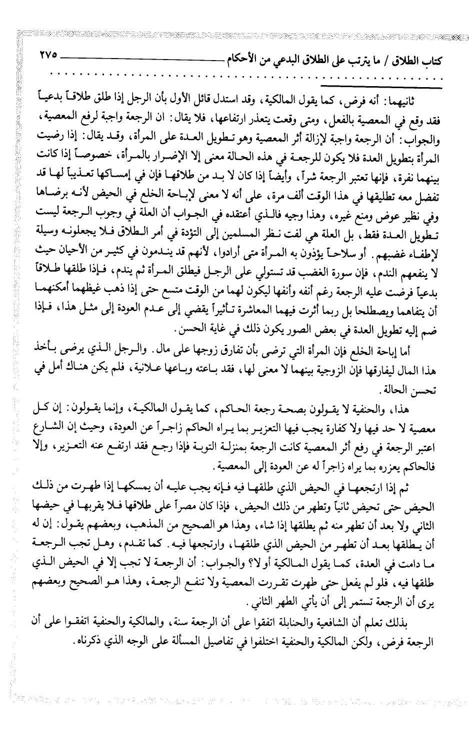 ثانيهما: أنه فرض، كما يقول المالكية، وقد استدل قائل الأول بأن الرجل إذا طلق طلاقاً بدعياً فقد وقع في المعصية بالفعل، ومتى يتعذر ارتفاعها، فلا يقال: إن الرجعة واجبة لرفع المعصية، والجواب: أن الرجعة واجبة لإزالة أثر المعصية وهو تطويل العدة على المرأة، وقد يقال: إذا رضيت المرأة بتطويل العدة فلا يكون للرجعة في هذه الحالة معنى إلا الإضرار بالمرأة، خصوصاً إذا كانت بينهما نفرة، فإنها تعتبر الرجعة شراً، وأيضاً إذا كان لا بد من طلاقها فإن في إمساكها تعذيباً لها قد تفضل معه تطليقها في هذا الوقت ألف مرة، على أنه لا معنى لإباحة الخلع في الحيض لأنه برضاها وفي نظير عوض ومنع غيره، وهذا وجيه فالذي أعتقده في الجواب أن العلة في وجوب الرجعة ليست تطويل العدة فقط، بل العلة هي لفت نظر المسلمين إلى التؤدة في أمر الطلاق فلا يجعلونه وسيلة لإطفاء غضبهم. أو سلاحاً يؤذون به المرأة متى أرادوا، لأنهم قد يندمون في كثير من الأحيان حيث لا ينفعهم الندم، فإن سورة الغضب قد تستولي على الرجل فيطلق المرأة ثم يندم، فإذا طلقها طلاقاً بدعياً فرضت عليه الرجعة رغم أنفه وأنفها ليكون لهما من الوقت متسع حتى إذا ذهب غيظهما أمكنهما أن يتفاهما ويصطلحا بل ربما أثرت فيهما المعاشرة تأثيراً يقضي إلى عدم العودة إلى مثل هذا، فإذا ضم إليه تطويل العدة في بعض الصور يكون ذلك في غاية الحسن.