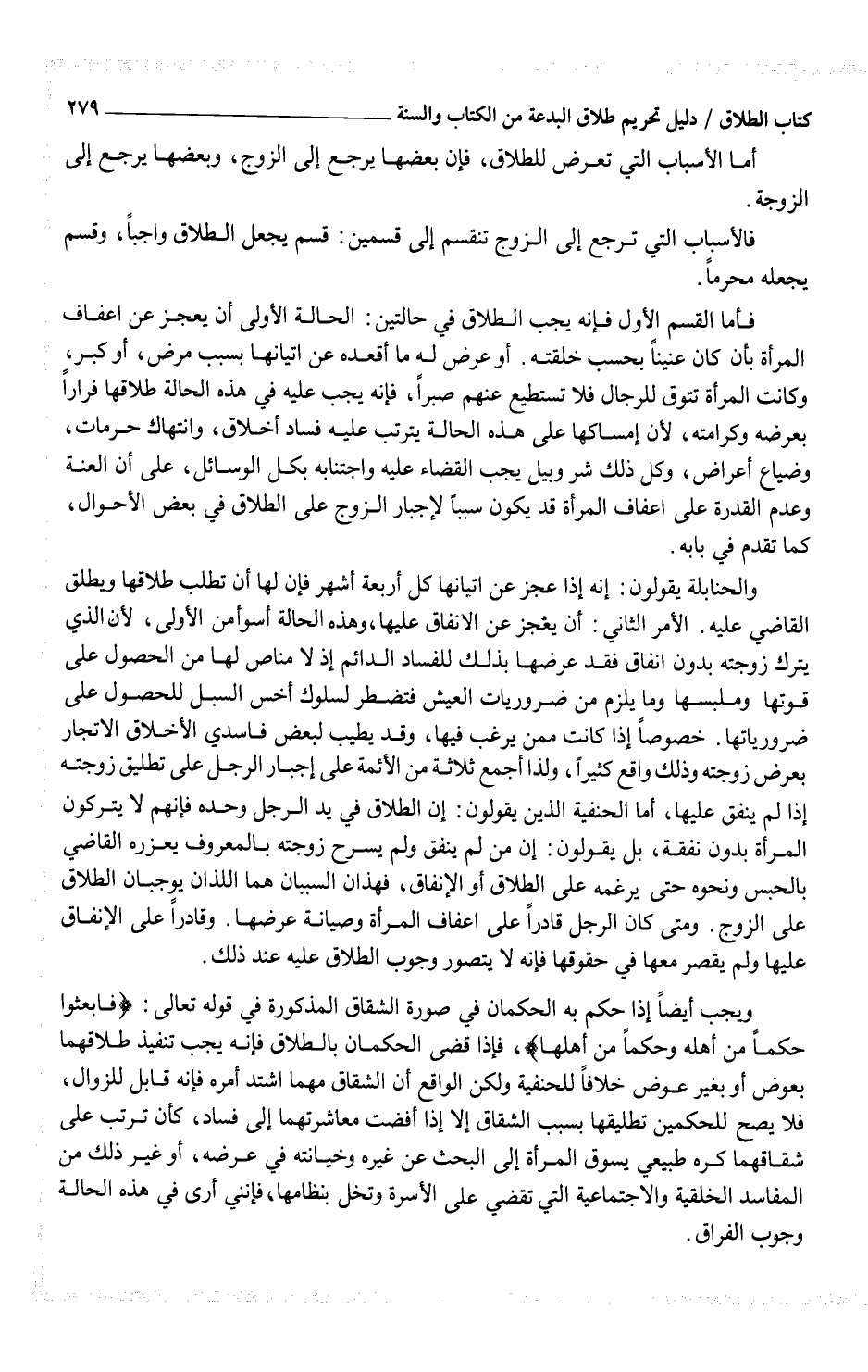 والحنابلة يقولون: إنه إذا عجز عن اتيانها كل أربعة أشهر فإن لها أن تطلب طلاقها ويطلق القاضي عليه. الأمر الثاني: أن يعجز عن الانفاق عليها، وهذه الحالة أسوأ من الأولى، لأن الذي يترك زوجته بدون انفاق فقد عرضها بذلك للفساد الدائم إذ لا مناص لها من الحصول على قوتها وملبسها وما يلزم من ضروريات العيش فتضطر لسلوك أخس السبل للحصول على ضرورياتها. خصوصاً إذا كانت ممن يرغب فيها، وقد يطيب لبعض فاسدي الأخلاق الاتجار بعرض زوجته وذلك واقع كثيراً، ولذا أجمع ثلاثة من الأئمة على إجبار الرجل على تطليق زوجته إذا لم ينفق عليها، أما الحنفية الذين يقولون: إن الطلاق في يد الرجل وحده فإنهم لا يتركون المرأة بدون نفقة، بل يقولون: إن من لم ينفق ولم يسرح زوجته بالمعروف يعزره القاضي بالحبس ونحوه حتى يرغمه على الطلاق أو الإنفاق، فهذان السببان هما اللذان يوجبان الطلاق على الزوج. ومتى كان الرجل قادراً على اعفاف المرأة وصيانة عرضها. وقادراً على الإنفاق عليها ولم يقصر معها في حقوقها فإنه لا يتصور وجوب الطلاق عليه عند ذلك.
