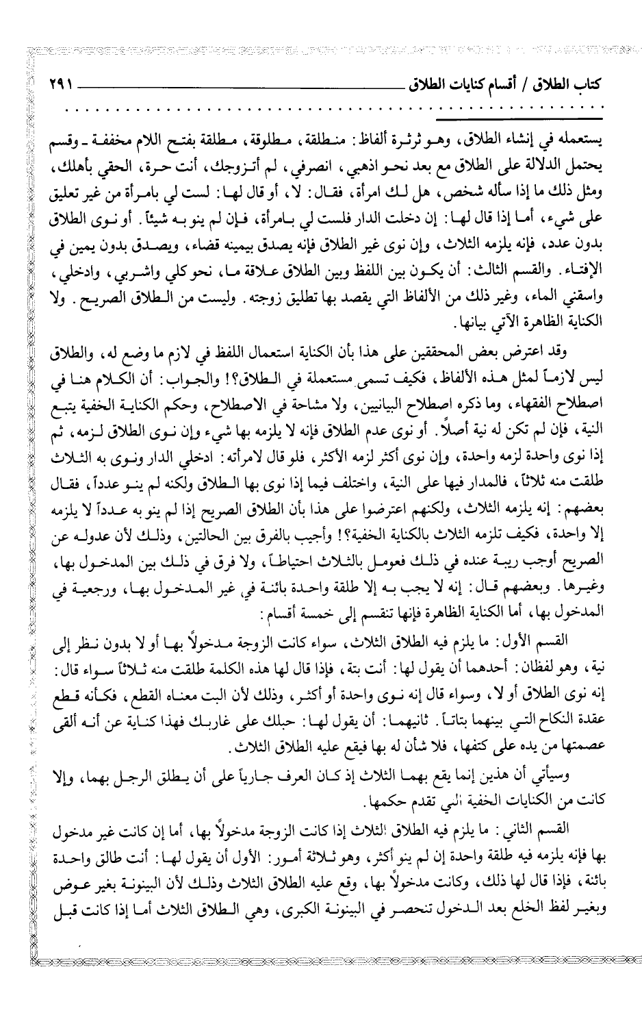وقد اعترض بعض المحققين على هذا بأن الكناية استعمال اللفظ في لازم ما وضع له، والطلاق ليس لازماً لمثل هذه الألفاظ، فكيف تسمى مستعملة في الطلاق؟! والجواب: أن الكلام هنا في اصطلاح الفقهاء، وما ذكره اصطلاح البيانيين، ولا مشاحة في الاصطلاح، وحكم الكناية الخفية يتبع النية، فإن لم تكن له نية أصلاً. أو نوى عدم الطلاق فإنه لا يلزمه بها شيء وإن نوى الطلاق لزمه، ثم إذا نوى واحدة لزمه واحدة، وإن نوى أكثر لزمه الأكثر، فلو قال لامرأته: ادخلي الدار ونوى به ثلاث طلقت منه ثلاثاً، فالمدار فيها على النية، واختلف فيما إذا نوى بها الطلاق ولكنه لم ينو عدداً، فقال بعضهم: إنه يلزمه الثلاث، ولكنهم اعترضوا على هذا بأن الطلاق الصريح إذا لم ينو به عدداً لا يلزمه إلى واحدة، فكيف تلزمه الثلاث بالكناية الخفية؟! وأجيب بالفرق بين الحالتين، وذلك لأن عدوله عن الصريح أوجب ريبة عنده في ذلك فعومل بالثلاث احتياطاً، ولا فرق في ذلك بين المدخول بها، وغيرها. وبعضهم قال: إنه لا يجب به إلا طلقة واحدة بائنة في غير المدخول بها، ورجعية في المدخول بها، أما الكناية الظاهرة فإنها تنقسم إلى خمسة أقسام: