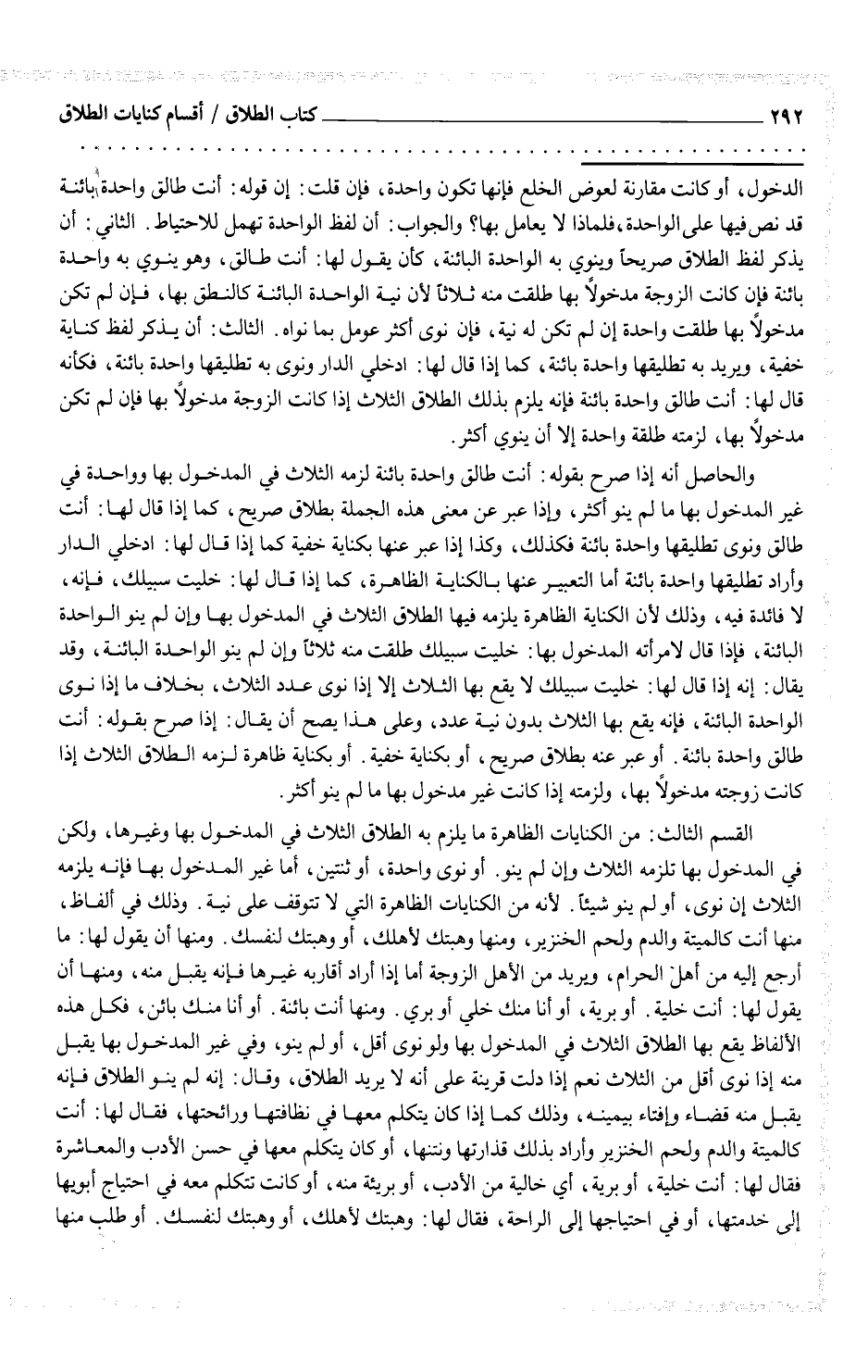 القسم الثالث: من الكنايات الظاهرة ما يلزم به الطلاق الثلاث في المدخول بها وغيرها، ولكن في المدخول بها تلزمه الثلاث وإن لك ينو. أو نوى واحدة، أو ثنتين، أما غير المدخول بها فإنه يلزمه الثلاث إن نوى، أو لم ينو شيئاً. لأنه من الكنايات الظاهرة التي لا تتوقف على نية.