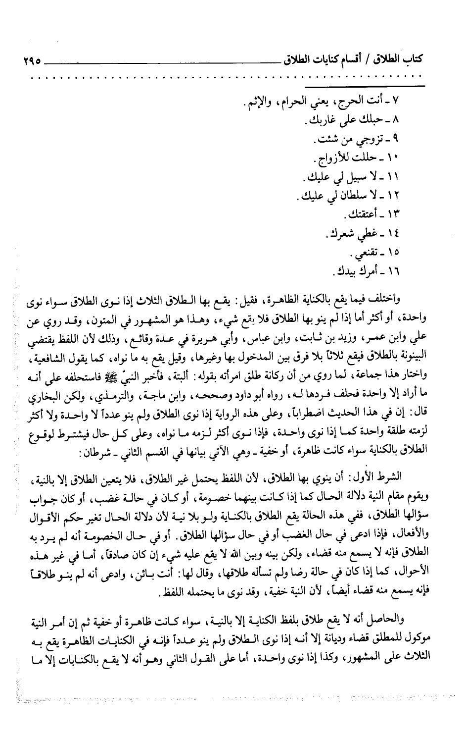 وزيد بن ثابت، وابن عباس، وأبي هريرة في عدة وقائع، وذلك لأن اللفظ يقتضي البينونة بالطلاق فيقع ثلاثاً بلا فرق بين المدخول بها وغيرها، وقيل يقع به ما نواه، كما يقول الشافعية، واختار هذا جماعة، لما روي من أن ركانة طلق امرأته بقوله: ألبتة، فأخبر النبيّ صلى الله عليه وسلم فاستحلفه على أنه ما أراد إلا واحدة فحلف فردها له، رواه أبو داود وصححه، وابن ماجة، والترمذي، ولكن البخاري قال: إن في هذا الحديث اضطراباً، وعلى هذه الرواية إذا نوى الطلاق ولم ينو عدداً لا واحدة ولا لأكثر لزمته طلقة واحدة كما إذا نوى واحدة، فإذا نوى أكثر لزمه ما نواه، وعلى كل حال فيشترط لوقوع الطلاق بالكناية سواء كانت ظاهرة، أو خفية - وهي الآتي بيانها في القسم الثاني - شرطان: