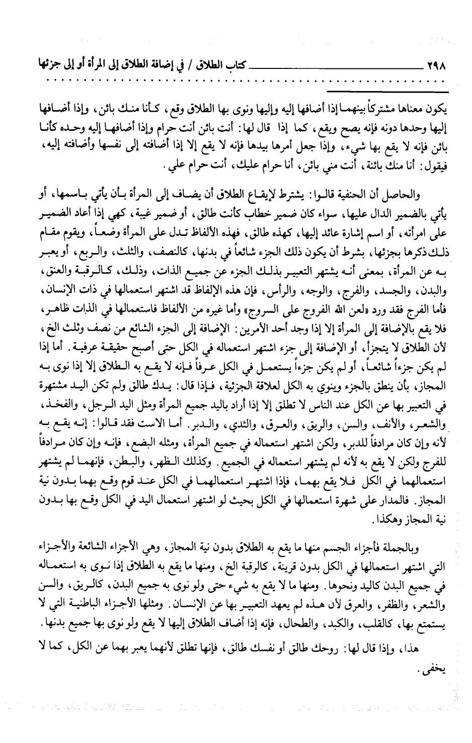 والحاصل أن الحنفية قالوا: يشترط لإيقاع الطلاق أن يضاف إلى المرأة بأن يأتي باسمها، أو يأتي بالضمير الدال عليها، سواء كان ضمر خطاب كأنت طالق، أو ضمير غيبة، كهي إذا أعاد الضمير عل امرأته، أو اسم إشارة عائد إليها، كهذه طالق، فهذه الألفاظ تدل على المرأة وضعاً، ويقوم مقام ذلك ذكرها بجزئها، بشرط أن يكون ذلك الجزء شائعاً في بدنها، كالنصف، والثلث، والربع، أو يعبر به عن المرأة، بمعنى أنه يشتهر التعبير بذلك الجزء عن جميع الذات، وذلك، كالرقبة والعنق، والبدن، والجسد، والفرج، والوجه، والرأس، فإن هذه الألفاظ قد اشتهر استعمالها في ذات الإنسان، فأما الفرج فقد ورد "لعن الله الفروج على السروج" وأما غيره من الألفاظ فاستعمالها في الذات ظاهر، فلا يقع بالإضافة إلى المرأة إلا إذا وجد أحد الأمرين: الإضافة إلى الجزء الشائع من نصف وثلث الخ، لأن الطلاق لا يتجزأ، أو الإضافة إلى جزء اشتهر استعماله في الكل حتى أصبح حقيقة عرفية. أما إذا لم يكن جزءاً شائعاً، أو لم يكن جزءاً يستعمل في الكل عرفاً فإنه لا يقع به الطلاق إلا إذا نوى به المجاز، بأن ينطق بالجزء وينوي به الكل لعلاقة الجزئية، فإذا قال: يدك طالق ولم تكن اليد مشتهرة في التعبير بها عن الكل عند الناس لا تطلق إلا إذا أراد باليد جميع المرأة ومثل اليد الرجل، والفخذ، والشعر، والأنف، والسن، والريق، والعرق، والثدي، والدبر. أما الاست فقد قالوا: إنه يقع به لأنه وإن كان مرادفاً للدبر، ولكن اشتهر استعماله في جميع المرأة، ومثله البضع، فإنه وإن كان مرادفاً للفرج ولكن لا يقع به لأنه لم يشتهر استعماله في الجميع. وكذلك الظهر، والبطن، فإنهما لم يشتهر استعمالهما في الكل فلا يقع بهما، فإذا اشتهر استعمالهما في الكل عند قوم وقع بهما بدون نية المجاز.