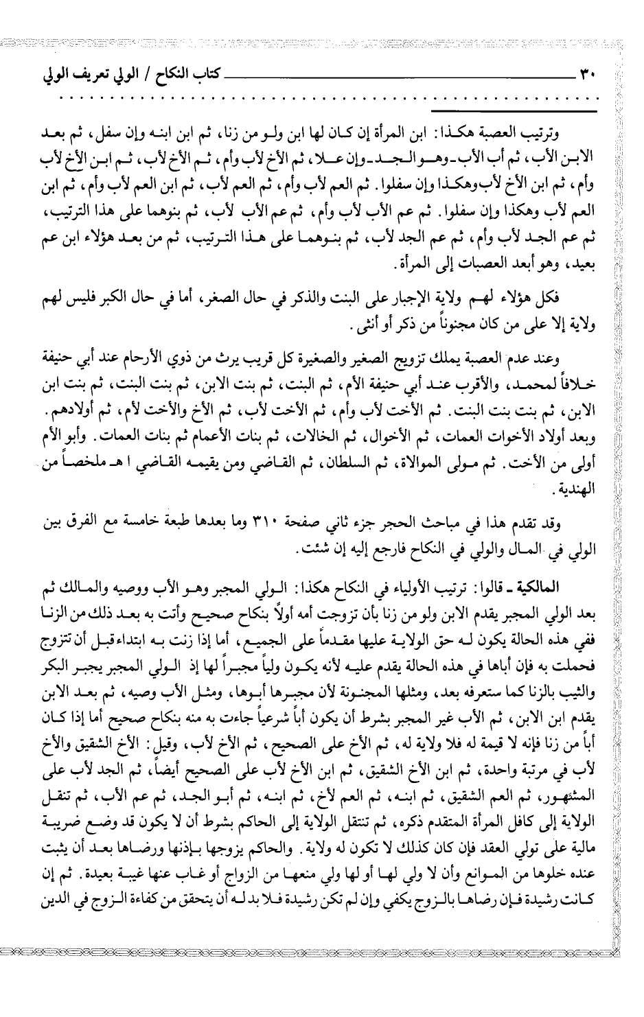 المالكية - قالوا: ترتيب الأولياء في النكاح هكذا: الولي المجبر وهو الأب ووصيه والمالك ثم بعد الولي المجبر يقدم الابن ولو من زنا بأن تزوجت أمه أولاً بنكاح صحيح وأتت به بعد ذلك من الزنا ففي هذه الحالة يكون له حق الولاية عليها مقدماً على الجميع، أما إذا زنت به ابتداء قبل أن تتزوج فحملت به فإن أباها في هذه الحالة يقدم عليه لأنه يكون ولياً مجبراً لها إذ الولي المجبر يجبر البكر والثيب بالزنا كما ستعرفه بعد، ومثلها المجنونة لأن مجبرها أبوها، ومثل الأب وصيه، ثم بعد الابن يقدم ابن الابن، ثم الأب غير المجبر بشرط أن يكون أباً شرعياً جاءت به منه بنكاح صحيح أما إذا كان أباً من زنا فإنه لا قيمة له فلا ولاية له، ثم الأخ على الصحيح، ثم الأخ لأب، وقيل: الأخ الشقيق والأخ لأب في مرتبة واحدة، ثم ابن الأخ الشقيق، ثم ابن الأخ لأب على الصحيح أيضاً، ثم الجد لأب على المشهور، ثم العم الشقيق، ثم ابنه، ثم العم لأخ، ثم ابنه، ثم أبو الجد، ثم عم الأب، ثم تنقل الولاية إلى كافل المرأة المتقدم ذكره، ثم تنتقل الولاية إلى الحاكم بشرط أن لا يكون قد وضع ضريبة مالية على تولي العقد فإن كان كذلك لا تكون له ولاية. والحاكم يزوجها بإذنها ورضاها بعد أن يثبت عنده خلوها من الموانع وأن لا ولي لها أو لها ولي منعها من الزواج أو غاب عنها غيبة بعيدة. ثم إن كانت رشيدة فإن رضاها بالزوج يكفي وإن لم تكن رشيدة فلا بد له أن يتحقق من كفاءة الزوج في الدين