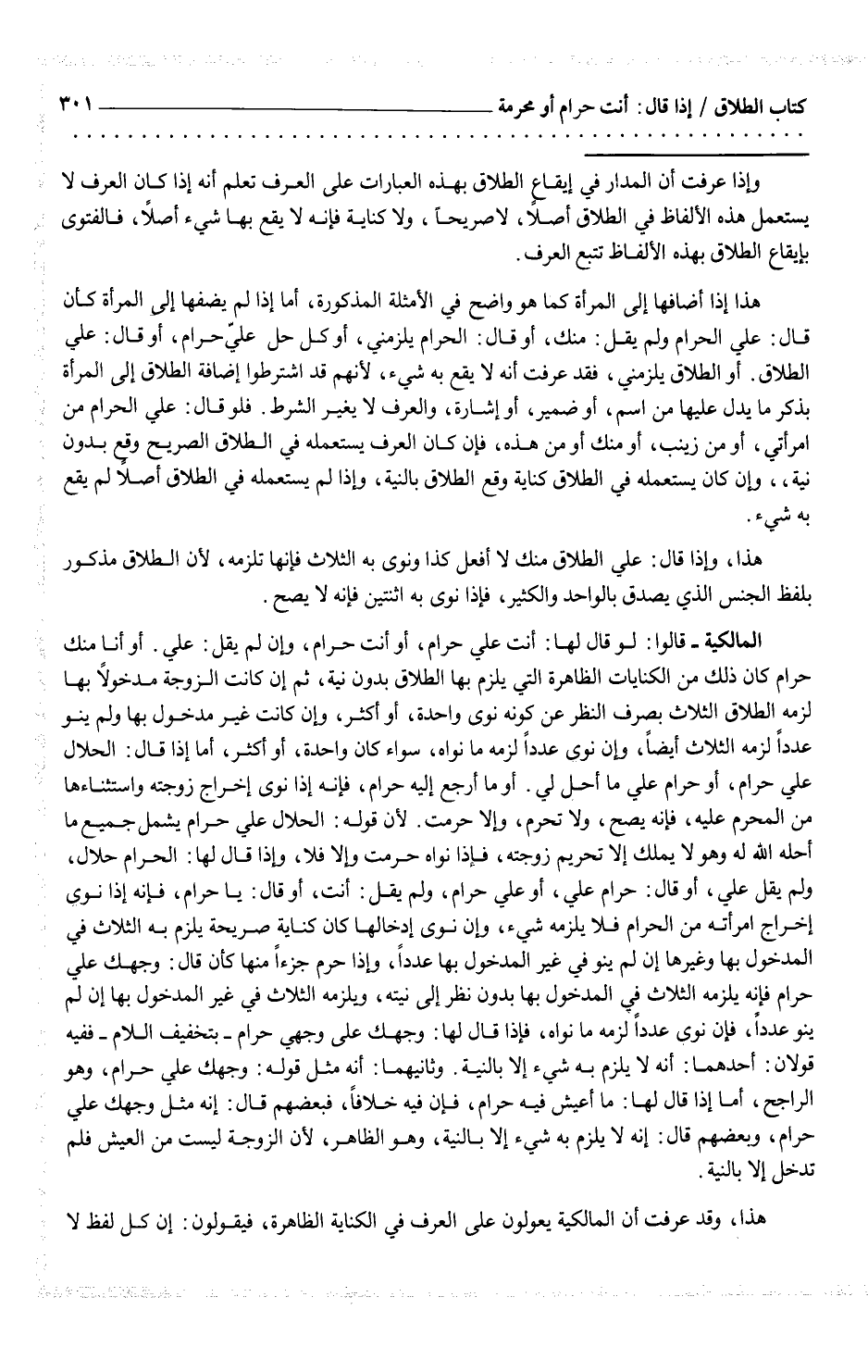 هذا، وإذا قال: علي الطلاق منك لا أفعل كذا ونوى به الثلاث فإنها تلزمه، لأن الطلاق المذكور بلفظ الجنس الذي يصدق بالواحد والكثير، فإذا نوى به اثنتين فإنه لا يصح. المالكية - قالوا: لو قال لها: أنت علي حرام، أو أنت حرام، وإن لم يقل: علي. أو أنا منك حرام كان ذلك من الكنايات الظاهرة التي يلزم بها الطلاق بدون نية، ثم إن كانت الزوجة مدخولاً بها لزمه الطلاق الثلاث بصرف النظر عن كونه نوى واحدة، أو أكثر، وإن كانت غير مدخول بها ولم ينو عدداً لزمه الثلاث أيضاً، وإن نوى عدداً لزمه ما نواه، سواء كان واحدة، أو أكثر، أما إذا قال: الحلال علي حرام، أو حرام علي ما أحل لي، أو ما أرجع إليه حرام، فإنه إذا نوى إخراج زوجته واستثناءها من المحرم عليه، فإنه يصح، ولا تحرم، وإلا حرمت، لأن قوله: الحلال علي حرام يشمل جميع ما أحله الله له وهو لا يملك إلا تحريم زوجته، فإذا نواه حرمت وإلا فلا، وإذا قال لها: الحرام حلال، ولم يقل علي، أو قال: حرام علي، أو علي حرام، ولم يقل: أنت، أو قال: يا حرام، فإنه إذا نوى إخراج امرأته من الحرام فلا يلزمه شيء، وإن نوى إدخالها كان كناية صريحة يلزم به الثلاث في المدخول بها وغيرها إن ينو في غير المدخول بها عدداً، وإذا حرم جزءاً منها كأن قال: وجهك علي حرام فإنه يلزمه الثلاث في المدخول بها بدون نظر إلى نيته، ويلزمه الثلاث في غير المدخول بها إن لم ينو عدداً، فإن نوى عدداً لزمه ما نواه، فإذا قال لها: وجهك على وجهي حرام - بتخفيف اللام - ففيه قولان: أحدهما: أنه لا يلزم به شيء إلا بالنية.