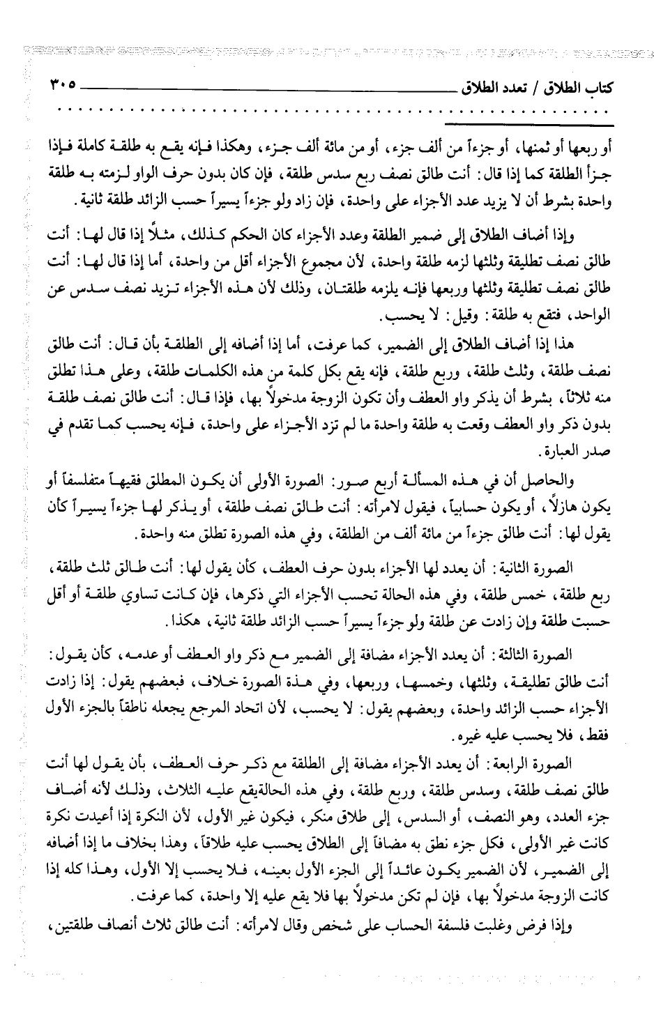 الصورة الرابعة: أن يعدد الأجزاء مضافة إلى الطلقة مع ذكر حرف العطف، بأن يقول لها أنت طالق نصف طلقة، وسدس طلقة، وربع طلقة، وفي هذه الحالة يقع عليه الثلاث، وذلك أن أضاف جزء العدد، وهو النصف، أو السدس، إلى طلاق منكر، فيكون غير الأول، لأن النكرة إذا أعيدت نكرة كانت غير الأولى، فكل جزء نطق به مضافاً إلى الطلاق يحسب عيه طلاقاً، وهذا بخلاف ما إذا أضافه إلى الضمير، لأن الضمير يكون عائداً إلى الجزء الأول بعينه، فلا يحسب إلا الأول، وهذا كله إذا كانت الزوجة مدخولاً بها، فإن لم تكن مدخولاً بها فلا يقع عليه إلا واحدة، كما عرفت.