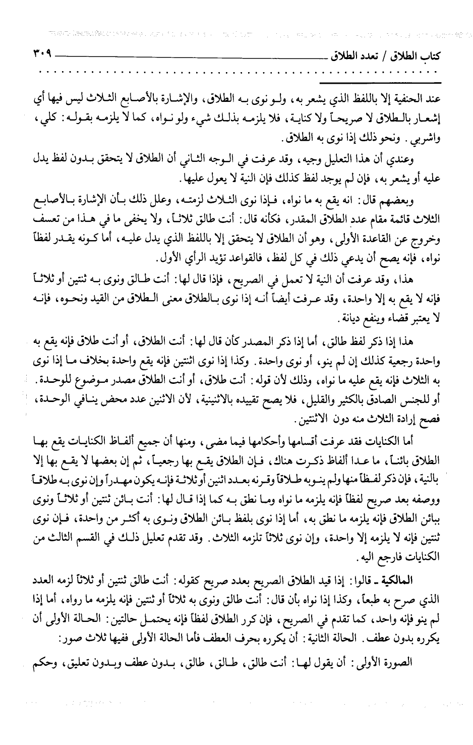 هذا إذا ذكر لفظ طالق، أما إذا ذكر المصدر كأن قال لها: أنت الطلاق، أو أنت طلاق فإنه يقع به واحدة رجعية كذلك إن لم ينو، أو نوى واحدة، وكذا إذا نوى اثنتين فإنه يقع واحدة بخلاف ما إذا نوى به الثلاث فإنه يقع عليه ما نواه، وذلك لأن قوله: أنت طلاق، أو أنت الطلاق مصدر موضوع للوحدة. أو للجنس الصادق بالكثير والقليل، فلا يصح تقييده بالاثنينية، لأن الاثنين عدد محض ينافي الوحدة، فصح إرادة الثلاث منه دون الاثنين. أما الكنايات فقد عرفت أقسامها وأحكامها فيما مضى، ومنها أن جميع ألفاظ الكنايات يقع بها الطلاق بائناً، ما عدا ألفاظ ذكرت هناك، فإن الطلاق يقع بها رجعياً، ثم إن بعضها لا يقع بها إلا بالنية، فإن ذكر لفظاً منها ولم ينويه طلاقاً وقرنه بعدد اثنين أو ثلاثة فإنه يكون مهدراً وإن نوى به طلاقاً ووصفه بعد صريح لفظاً فإنه يلزمه ما نواه وما نطق به كما إذا قال لها: أنت بائن ثنتين أو ثلاثاً ونوى ببائن الطلاق فإنه يلزمه ما نطق به، أما إذا نوى بلفظ بائن الطلاق ونوى به أكثر من واحدة، فإن نوى ثنتين فإنه لا يلزمه إلا واحدة، وإن نوى ثلاثاً تلزمه الثلاث. وقد تقدم تعليل ذلك في القسم الثالث من الكنايات فارجع إليه.