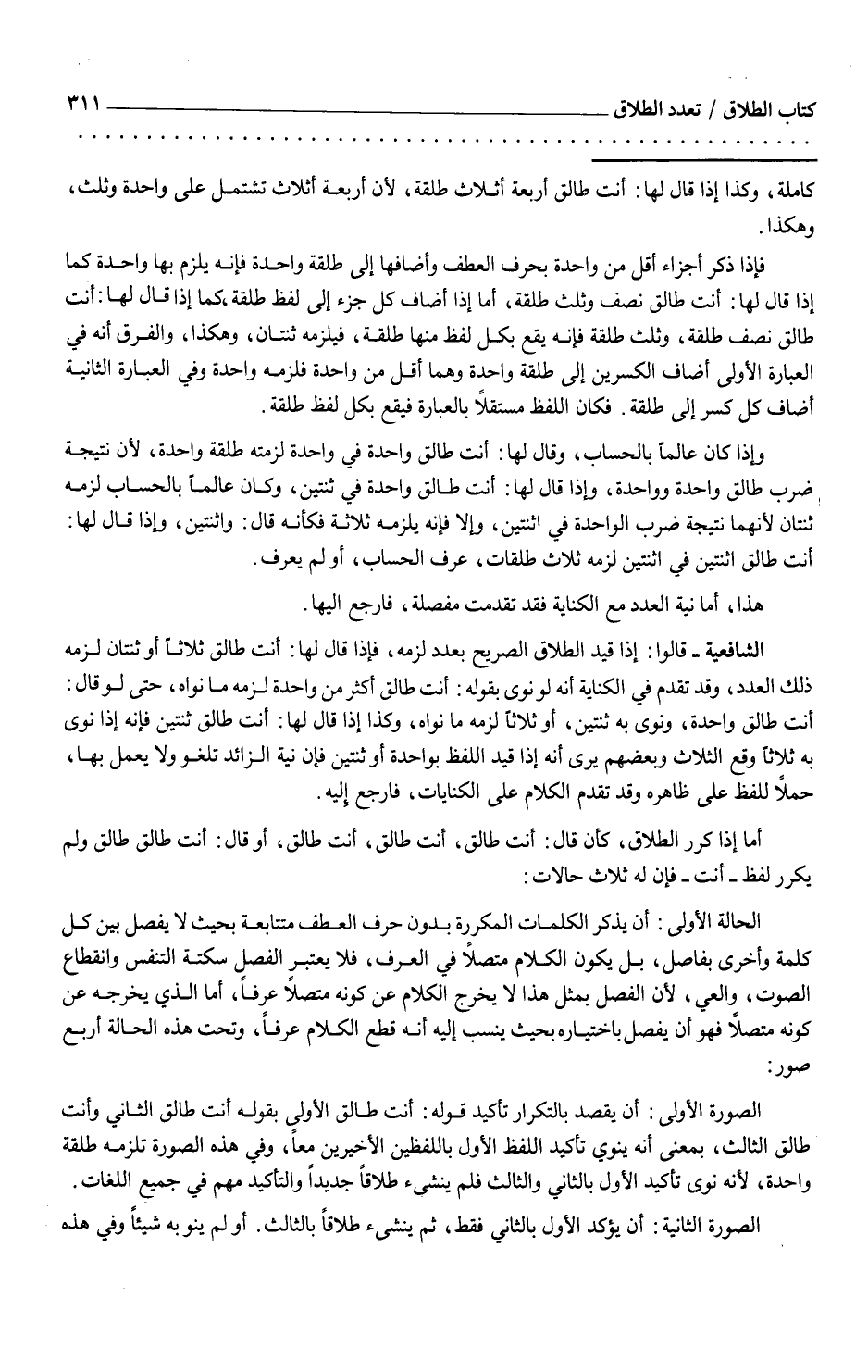 فإذا ذكر أجزاء أقل من واحدة بحرف العطف وأضافها إلى طلقة واحدة فإنه يلزم بها واحدة كما إذا قال لها: أنت طالق نصف وثلث طلقة، أما إذا أضاف كل جزء إلى لفظ طلقة، كما إذا قال لها: أنت طالق نصف طلقة، وثلث طلقة فإنه يقع بكل لفظ منها طلقة، فيلزمه ثنتان، وهكذا، والفرق أنه في العبارة الأولى أضاف الكسرين إلى طلقة واحدة وهما أقل من واحدة فلزمه واحدة وفي العبارة الثانية أضاف كل كسر إلى طلقة. فكان اللفظ مستقلاً بالعبارة فيقع بكل لفظ طلقة. وإذا كان عالماً بالحساب، وقال لها: أنت طالق في واحدة لزمته طلقة واحدة، لأن نتيجة ضرب طالق واحدة وواحدة، وإذا قال لها: أنت طالق واحدة في ثنتين، وكان عالماً بالحساب لزمه ثنتان لأنهما نتيجة ضرب الواحدة في اثنتين، وإلا فإنه يلزمه ثلاثة فكأنه قال: واثنتين، وإذا قال لها: أنت طالق اثنتين في اثنتين لزمه ثلاث طلقات، عرف الحساب، أو لم يعرف.