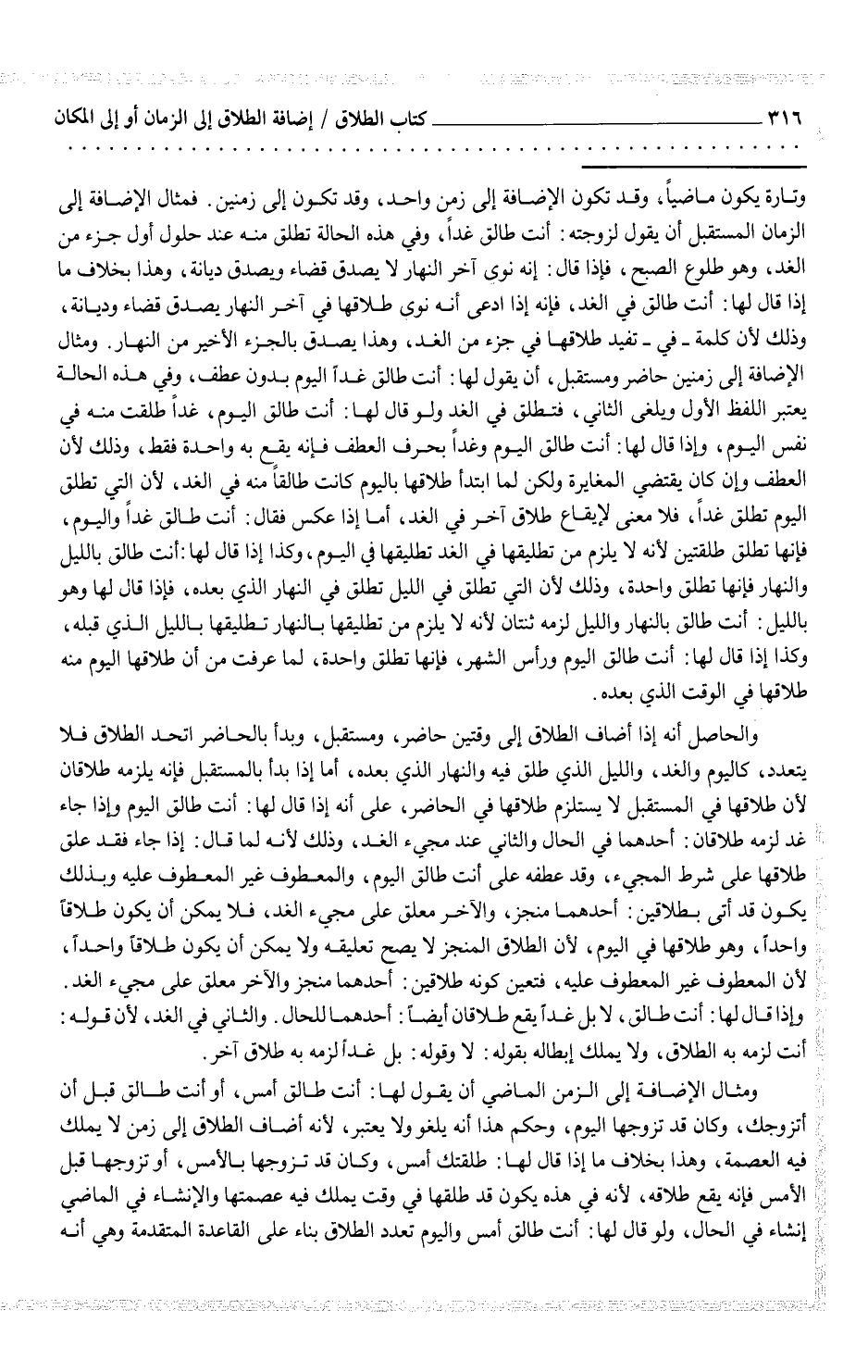 وتارة يكون ماضياً، وقد تكون الإضافة إلى زمن واحد، وقد تكون إلى زمنين. فمثال الإضافة إلى الزمان المستقبل أن يقول لزوجته: أنت طالق غداً، وفي هذه الحالة تطلق منه عند حلول أول جزء من الغد، وهو طلوع الصبح، فإذا قال: إنه نوى آخر النهار لا يصدق قضاء ويصدق ديانة، وهذا بخلاف ما إذا قال لها: أنت طالق في الغد، فإنه إذا ادعى انه نوى طلاقها في آخر النهار يصدق قضاء وديانة، وذلك لأن كلمة - في - تفيد طلاقها في جزء من الغد، وهذا يصدق بالجزء الأخير من النهار. ومثال الإضافة إلى زمنين حاضر ومستقبل، أن يقول لها: أنت طالق غداً اليوم بدون عطف، وفي هذه الحالة يعتبر اللفظ الأول ويلغى الثاني، فتطلق في الغد ولو قال لها: أنت طالق اليوم، غداً طلقت منه في نفس اليوم، وإذا قال لها: أنت طالق اليوم وغداً بحرف العطف فإنه يقع به واحدة فقط، وذلك لأن العطف وإن كان يقتضي المغايرة ولكن لما ابتدأ طلاقها باليوم كانت طالقاً منه في الغد، لأن التي تطلق اليوم تطلق غداً، فلا معنى لإيقاع طلاق آخر في الغد، أما إذا عكس فقال: أنت طالق غداً واليوم، فإنها تطلق طلقتين لأنه لا يلزم من تطليقها في الغد تطليقها في اليوم، وكذا إذا قال لها: أنت طالق بالليل والنهار فإنها تطلق واحدة، وذلك لن التي تطلق في الليل تطق في النهار الذي بعده، فإذا قال لها وهو بالليل: أنت طالق بالنهار والليل يلزمه ثنتان لأنه لا يلزم من تطليقها بالنهار تطليقها بالليل الذي قبله، وكذا إذا قال لها: أنت طالق اليوم ورأس الشهر، فإنها تطلق واحدة، لما عرفت من أن طلاقها اليوم منه طلاقها في الوقت الذي بعده.