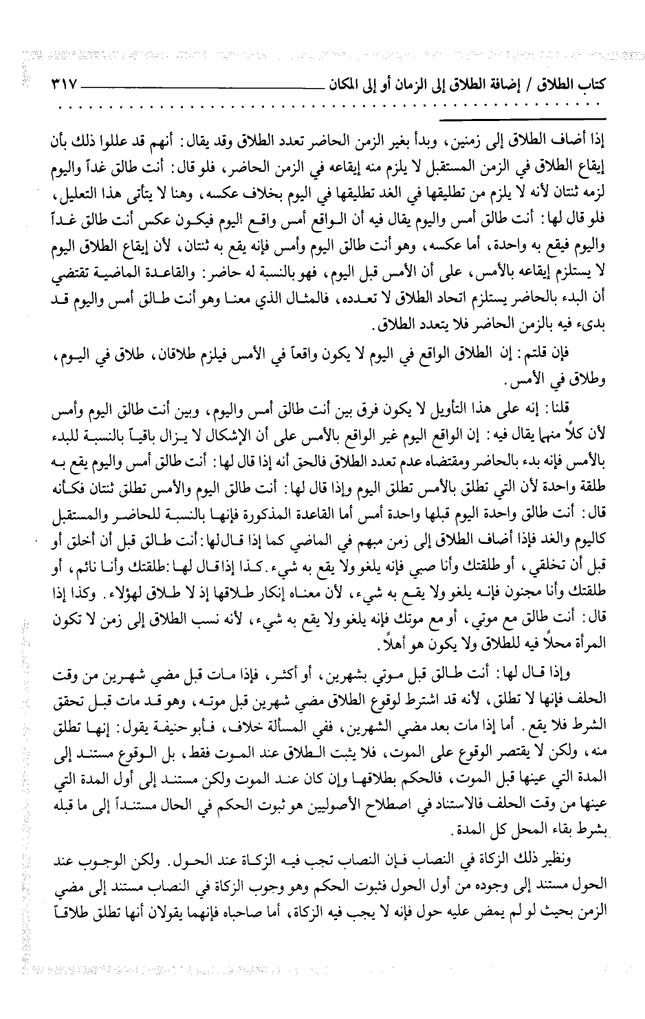 ونظير ذلك الزكاة في النصاب فإن النصاب تجب فيه الزكاة عند الحول. ولكن الوجوب عند الحول مستند إلى وجوده من أول الحول فثبوت الحكم وهو وجوب الزكاة في النصاب مستند إلى مضي الزمن بحيث لو لم يمض عليه حول فإنه لا يجب فيه الزكاة، أما صاحباه فإنهما يقولان أنها تطلق طلاقاً