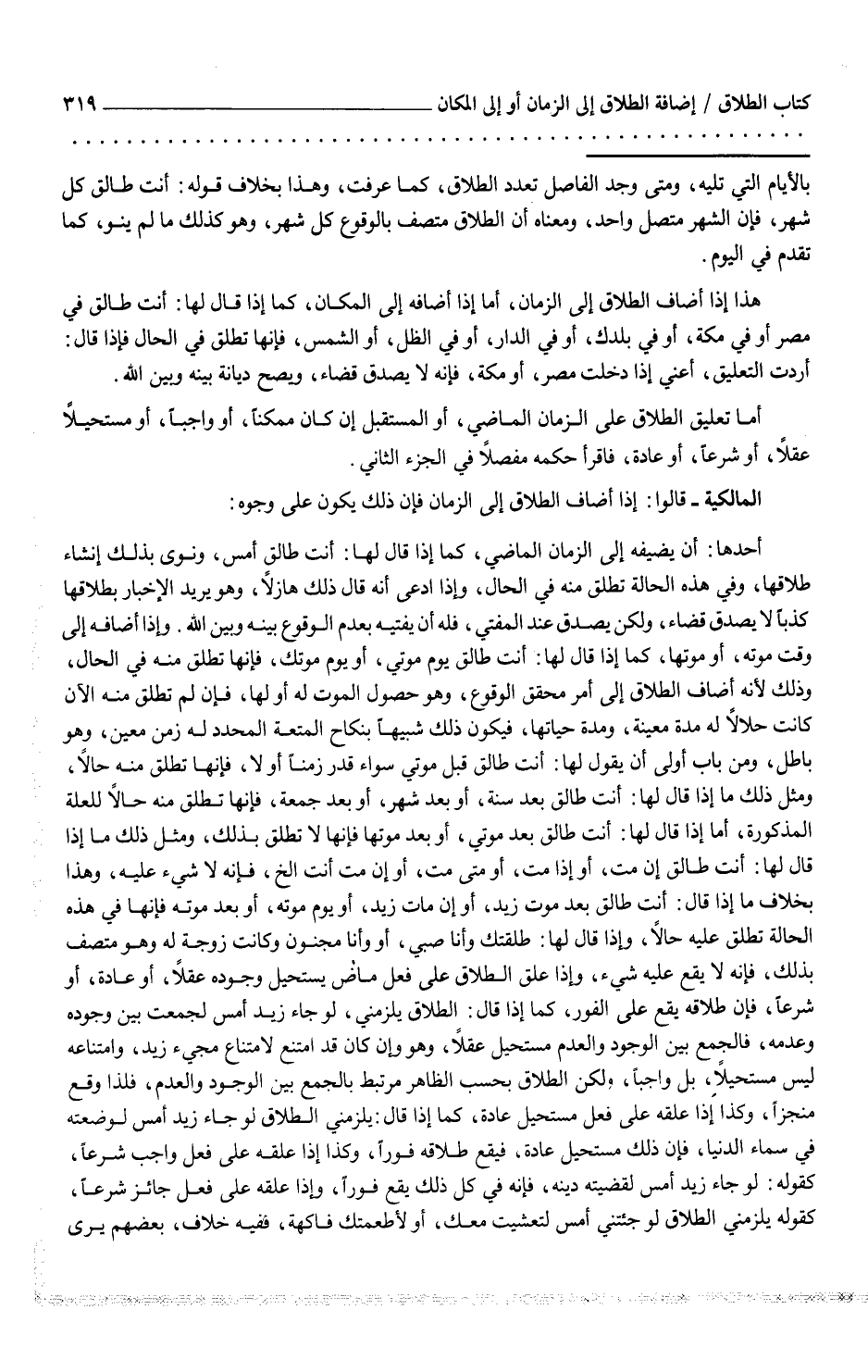 أحدها: أن يضيفه إلى الزمان الماضي، كما إذا قال لها: أنت طالق أمس، ونوى بذلك إنشاء طلاقها، وفي هذه الحالة تطلق منه في الحال، وإذا ادعى أنه قال ذلك هازلاً، وهو يريد الإخبار بطلاقها كذباً لا يصدق قضاء، ولكن يصدق عند المفتي، فله أن يفتيه بعدم الوقوع بينه وبين الله. وإذا أضافه إلى وقت موته، أو موتها، كما إذا قال لها: أنت طالق يوم موتي، أو يوم موتك، فإنها تطلق منه في الحال، وذلك لأنه أضاف الطلاق إلى أمر محقق الوقوع، وهو حصول الموت له أو لها، فإن لم تطلق منه الآن كانت حلالاً له مدة معينة، ومدة حياتها، فيكون ذلك شبيهاً بنكاح المتعة المحدد له زمن معين، وهو باطل، ومن باب أولى أن يقول لها: أنت طالق قبل موتي سواء قدر زمناً أو لا، فإنها تطلق منه حالاً، ومثل ذلك ما إذا قال لها: أنت طالق بعد سنة، أو بعد شهر، أو بعد جمعة، فإنها تطلق منه حالاً للعلة المذكورة، أما إذا قال لها: أنت طالق بعد موتي، أو بعد موتها فإنها لا تطلق بذلك، ومثل ذلك ما إذا قال لها: أنت طالق إن مت، أو إذا مت، أو متى مت، أو إن مت أنت الخ، فإنه لا شيء عليه، وهذا بخلاف ما إذا قال: أنت طالق بعد موت زيد، أو إن مات زيد، أو يوم موته، أو بعد موته فإنها في هذه الحالة تطلق عليه حالاً، وإذا قال لها: طلقتك وأنا صبي، أو وأنا مجنون وكانت زوجة له وهو متصف بذلك، فإنه لا يقع عليه شيء، وإذا علق الطلاق على فعل ماضي يستحيل وجوده عقلاً، أو عادة، أو شرعاً، فإن طلاقه يقع على الفور، كما إذا قال: الطلاق يلزمني، لو جاء زيد أمس لجمعت بين وجوده وعدمه، فالجمع بين الوجود والعدم مستحيل عقلاً، وهو وإن كان قد امتنع لامتناع مجيء زيد، وامتناعه ليس مستحيلاً، بل واجباً، ولكن الطلاق بحسب الظاهر مرتبط بالجمع بين الوجود والعدم، فلذا وقع منجزاً، وكذا إذا علقه