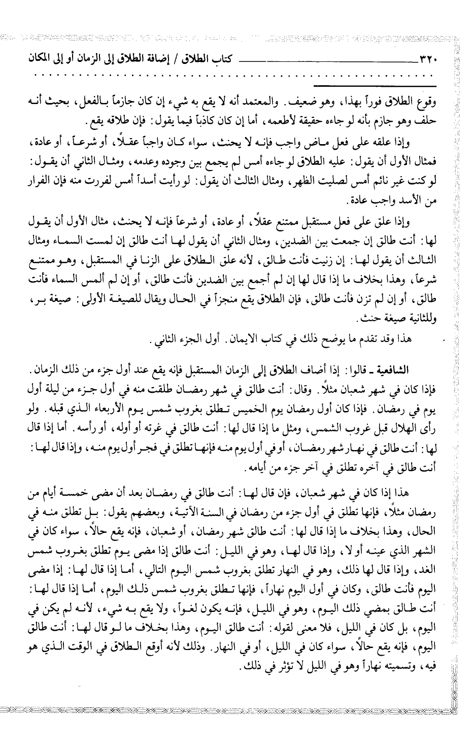 هذا إذا كان في شهر شعبان، فإن قال لها: أنت طالق في رمضان بعد أن مضى خمسة أيام من رمضان مثلاً، فإنها تطلق في أول جزء من رمضان في السنة الآتية، وبعضهم يقول: بل تطلق منه في الحال، وهذا بخلاف ما إذا قال لها: أنت طالق شهر رمضان، أو شعبان، فإنه يقع حالاً، سواء كان في الشهر الذي عينه أو لا، وإذا قال لها، وهو في الليل: أنت طالق إذا مضى يوم تطلق بغروب شمس الغد، وإذا قال لها ذلك، وهو في النهار تطلق بغروب شمس اليوم التالي، أما إذا قال لها: إذا مضى اليوم فأنت طالق، وكان في أول اليوم نهاراً، فإنها تطلق بغروب شمس ذلك اليوم، أما إذا قال لها: أنت طالق بمضي ذلك اليوم، وهو في الليل، فإنه يكون لغواً، ولا يقع به شيء، لأنه لم يكن في اليوم، بل كان في الليل، فلا معنى لقوله: أنت طالق اليوم، وهذا بخلاف ما لو قال لها: أنت طالق اليوم، فإنه يقع حالاً، سواء كان في الليل، أو في النهار. وذلك لأنه أوقع الطلاق في الوقت الذي هو فيه، وتسميته نهاراً وهو في الليل لا تؤثر في ذلك.