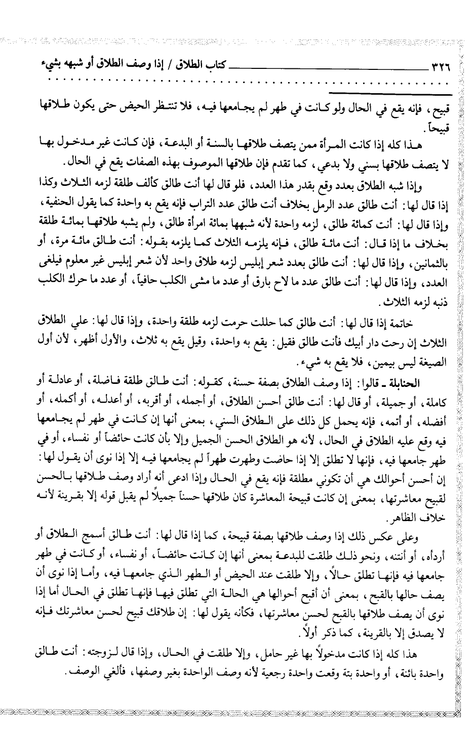 قبيح، فإنه يقع في الحال ولو كانت في طهر لم يجامعها فيه، فلا تنتظر الحيض حتى يكون طلاقها قبيحاً. هذا كله إذا كانت المرأة ممن يتف طلاقها بالسنة أو البدعة، فإن كانت غير مدخول بها لا يتصف طلاقها بسني ولا بدعي، كما تقدم فإن طلاقها الموصوف بهذه الصفات يقع في الحال.