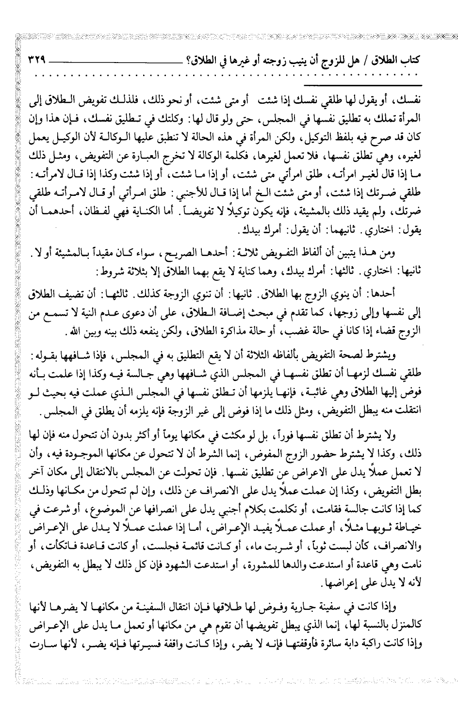 نفسك، أو يقول لها طلقي نفسك إذا شئت أو متى شئت، أو نحو ذلك، فلذلك تفويض الطلاق إلى المرأة تملك به تطليق نفسها في المجلس، حتى ولو قال لها: وكلتك في تطليق نفسك، فإن هذا وإن كان قد صرح فيه بلفظ التوكيل، ولكن المرأة في هذه الحالة لا تنطبق عليها الوكالة لأن الوكيل يعمل لغيره، وهي تطلق نفسها، فلا تعمل لغيرها، فكلمة الوكالة لا تخرج العبارة عن التفويض، ومثل ذلك ما إذا قال لغير امرأته، طلق امرأتي متى شئت، أو إذا ما شئت، أو إذا شئت وكذا إذا قال لامرأته: طلقي ضرتك إذا شئت، أو متى شئت الخ أما إذا قال للأجنبي: طلق امرأتي أو قال لامرأته طلقي ضرتك، ولم يقيد ذلك بالمشيئة، فإنه يكون توكيلاً لا تفويضاً. أما الكناية فهي لفظان، أحدهما أن يقول: اختاري. ثانيهما: أن يقول: أمرك بيدك.