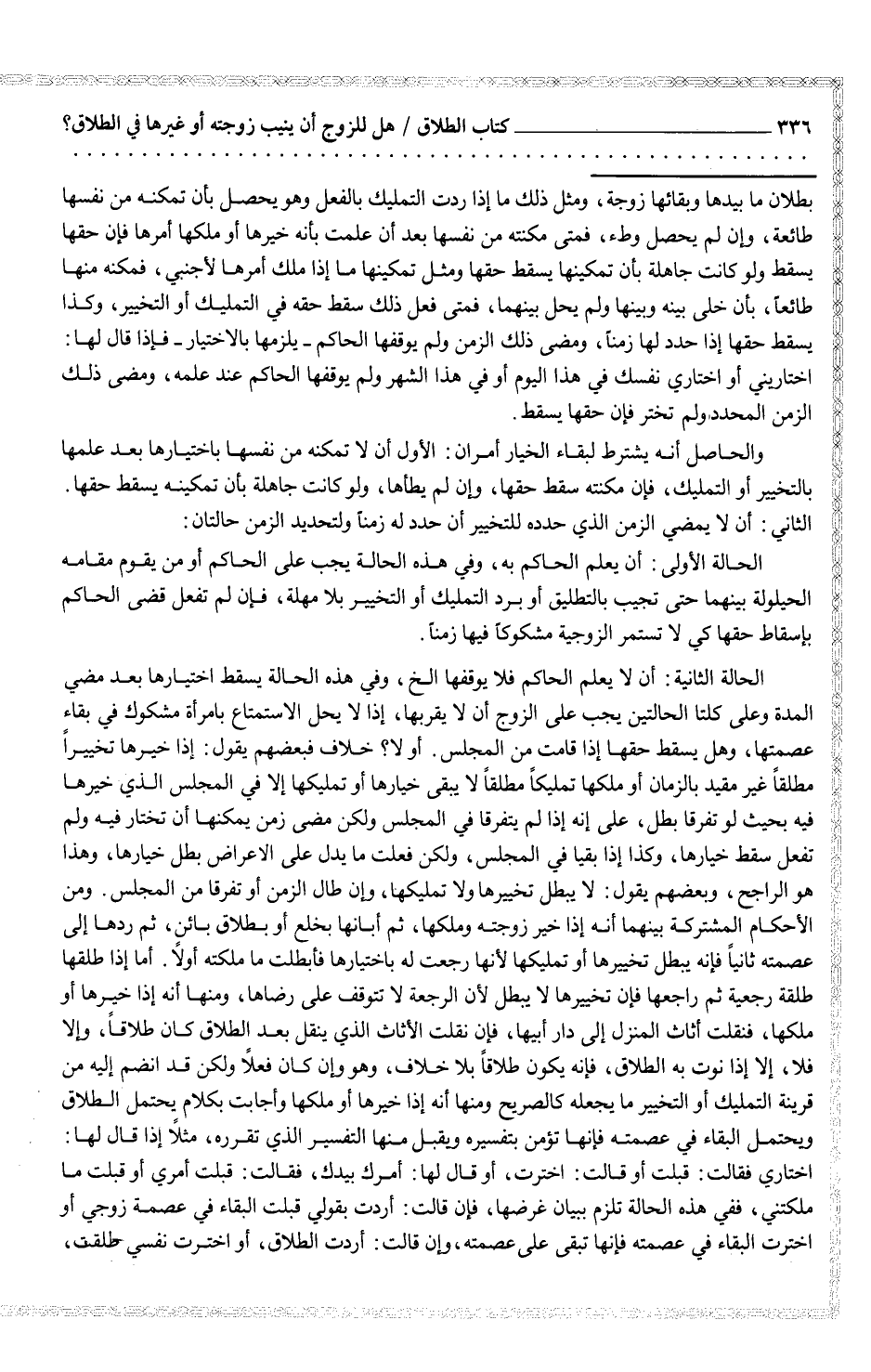 الحالة الثانية: أن لا يعلم الحاكم فلا يوقفها الخ، وفي هذه الحالة يسقط اختيارها بعد مضي المدة وعلى كلتا الحالتين يجب على الزوج أن لا يقربها، إذا لا يحل الاستمتاع بامرأة مشكوك في بقاء عصمتها، وهل يسقط حقها إذا قامت من المجلس. أو لا؟ خلاف فبعضهم يقول: إذا خيرها تخييراً مطلقاً غير مقيد بالزمان أو ملكها تمليكاً مطلقاً لا يبقى خيارها أو تمليكها إلا في المجلس الذي خيرها فيه بحيث لو تفرقا بطل، على إنه إذا لم يتفرقا في المجلس ولكن مضى زمن يمكنها أن تختار فيه ولم تفعل سقط خيارها، وكذا إذا بقيا في المجلس ولكن فعلت ما يدل على الاعراض بطل خيارها، وهذا هو الراجح، وبعضهم يقول: لا يبطل تخييرها ولا تمليكها، وإن طال الزمن أو تفرقا من المجلس. ومن الأحكام المشتركة بينهما أن إذا خير زوجته وملكها، ثم أبانها بخلع أو بطلاق بائن، ثم ردها إلى عصمته ثانياً فإنه يبطل تخييرها أو تمليكها لأنها رجعت له باختيارها فأبطلت ما ملكته أولاً.