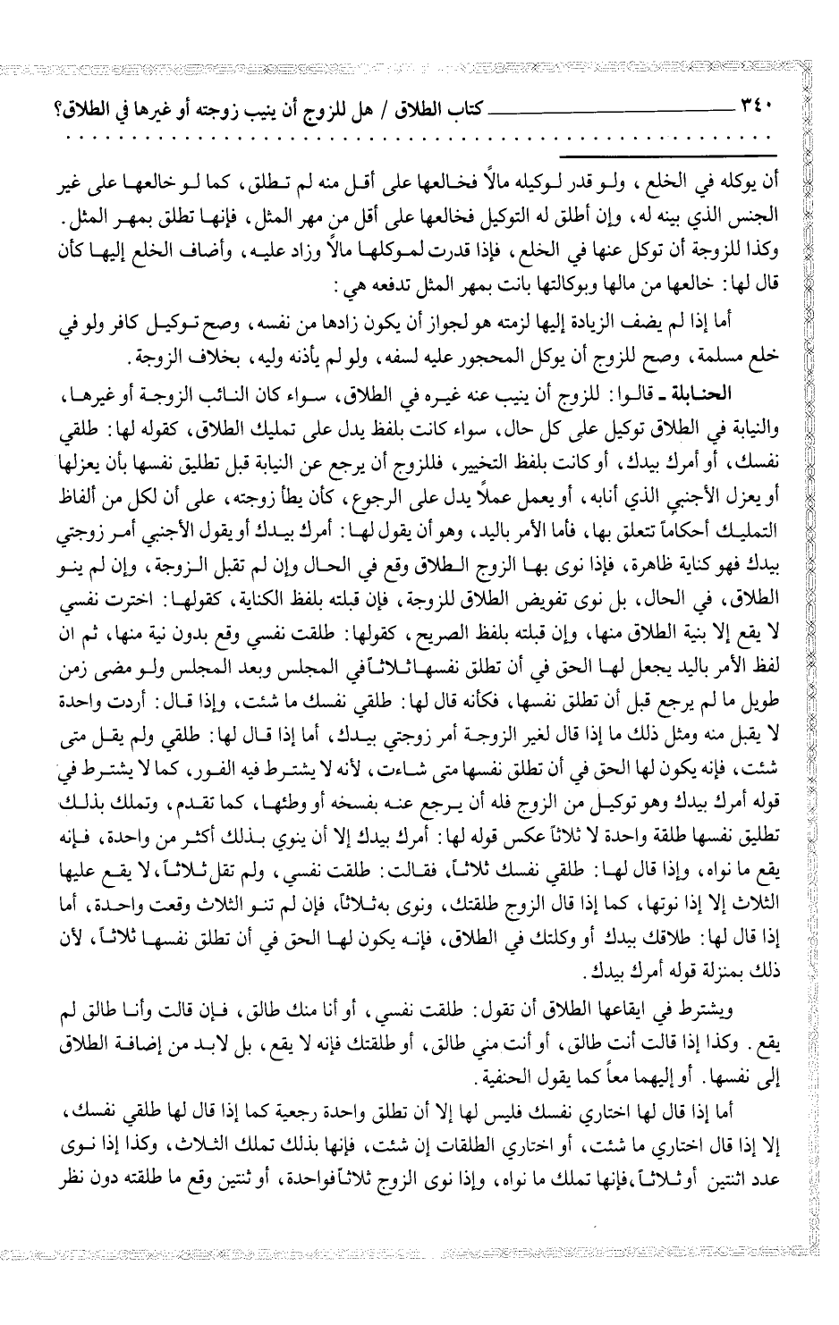 الحنابلة - قالوا: للزوج أن ينيب عنه غيره في الطلاق، سواء كان النائب الزوجة أو غيرها، والنيابة في الطلاق توكيل على حال، سواء كانت بلفظ يدل على تمليك الطلاق، كقوله لها: طلقي نفسك، أو أمرك بيدك، أو كانت بلفظ التخيير، فللزوج أن يرجع عن النيابة قبل تطليق نفسها بأن يعزلها أو يعزل الأجنبي الذي أنابه، أو يعمل عملاً يدل على الرجوع، كأن يطأ زوجته، على أن لكل من ألفاظ التمليك أحكاماً تتعلق بها، فأما الأمر باليد، وهو أن يقول لها: أمرك بيدك أو يقول الأجنبي أمر زوجتي بيدك فهو كناية طاهرة، فإذا نوى بها الزوج الطلاق وقع في الحال وإن لم تقبل الزوجة، وإن لم ينو الطلاق، في الحال، بل نوى تفويض الطلاق للزوجة، فإن قبلته بلفظ الكناية، كقولها: اخترت نفسي لا يقع إلا بنية الطلاق منها، وإن قبلته بلفظ الصريح، كقولها: طلقت نفسي وقع بدون نية منها، ثم إن لفظ الأمر باليد يجعل لها الحق في أن تطلق نفسها ثلاثاً في المجلس وبعد المجلس ولو مضى زمن طويل ما لم يرجع قبل أن تطلق نفسها، فكأنه قال لها: طلقي نفسك ما شئت، وإذا قال: أردت واحدة لا يقبل منه ومثل ذلك ما إذا قال لغير الزوجة أمر زوجتي بيدك، أما إذا قال لها: طلقي ولم يقل متى شئت، فإنه يكون لها الحق في أن تطلق نفسها متى شاءت، لأنه لا يشترط فيه الفور، كما لا يشترط في قوله أمرك بيدك وهو توكيل من الزوج فله يرجع عنه بفسخه أو وطئها، كما تقدم، وتملك بذلك تطليق نفسها طلقة واحدة لا ثلاثاً عكس قوله لها: أمرك بيدك إلا أنم ينوي بذلك أكثر من واحدة، فإنه يقع ما نواه، وإذا قال لها: طلقي نفسك ثلاثاً، فقالت: طلقت نفسي، ولم تقل ثلاثاً، لا يقع عليها الثلاث إلا إذا نوتها، كما إذا قال الزوج طلقتك، ونوى به ثلاثاً، فإن لم تنو الثلاث وقعت واحدة، أما إذا قال لها: طلاقك بيدك أو وكلتك