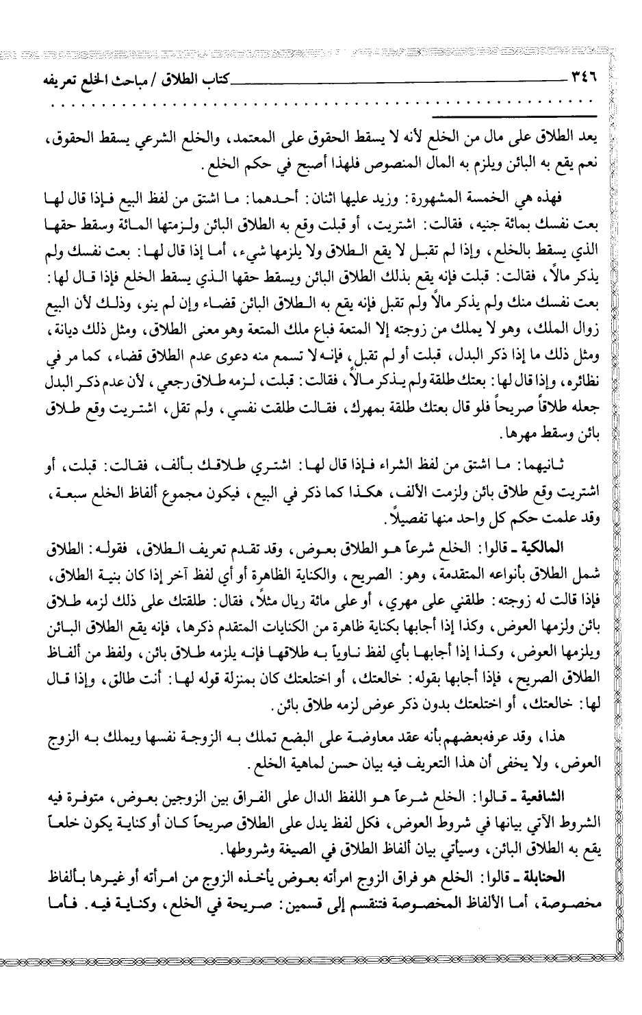 المالكية - قالوا: الخلع شرعاً هو الطلاق بعوض، وقد تقدم تعريف الطلاق، فقوله: الطلاق شمل الطلاق بأنواعه المتقدمة، وهو: الصريح، والكناية الظاهرة أو أي لفظ آخر إذا كان بنية الطلاق، فإذا قالت له زوجته: طلقني على مهري، أو على مائة ريال مثلاً، فقال: طلقتك على ذلك لزمه طلاق بائن ولزمها العوض، وكذا إذا أجابها بكناية ظاهرة من الكنايات المتقدم ذكرها، فإنه يقع الطلاق البائن ويلزمها العوض، وكذا إذا أجابها بأي لفظ ناوياً به طلاقها فإنه يلزمه طلاق بائن، ولفظ من ألفاظ الطلاق الصريح، فإذا أجابها بقوله: خالعتك، أو اختلعتك كان بمنزلة قوله لها: أنت طالق، وإذا قال لها: خالعتك، أو اختلعتك بدون ذكر عوض لزمه طلاق بائن. هذا، وقد عرفه بعضهم بأنه عقد معاوضة على البضع تملك به الزوجة نفسها ويملك به الزوج العوض، ولا يخفى أن هذا التعريف فيه بيان حسن لماهية الخلع.